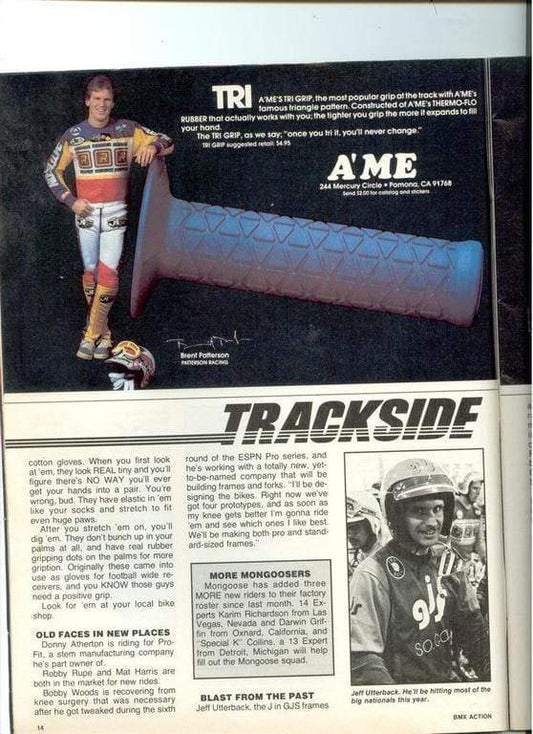 A'ME grips were used by our own Robinson and Torker BMX teams in the 1980's. A'ME grips are still made in the USA with all the great designs you remember like the Tri, Round, Cam, Mini, Full and Half Waffle in a ton of colours to match your Old School resto - plus re-issue Unitrons and Duals and the brand new Super Tri  and Pro Lock On grips for your modern ride.