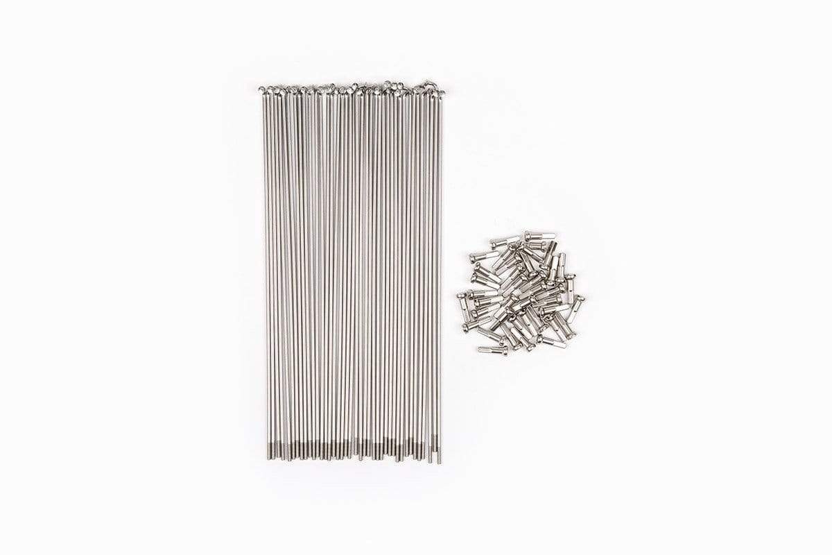 Pack of 40 genuine BSD straight gauge stainless steel spokes and brass nipples available in black and stainless finishes.