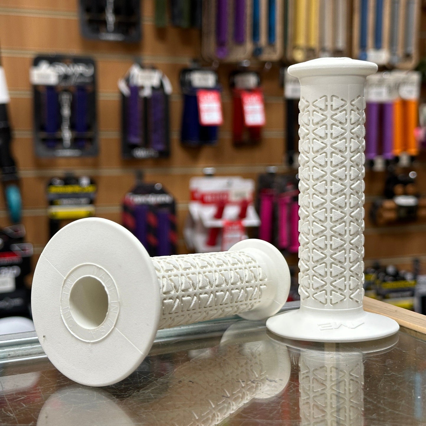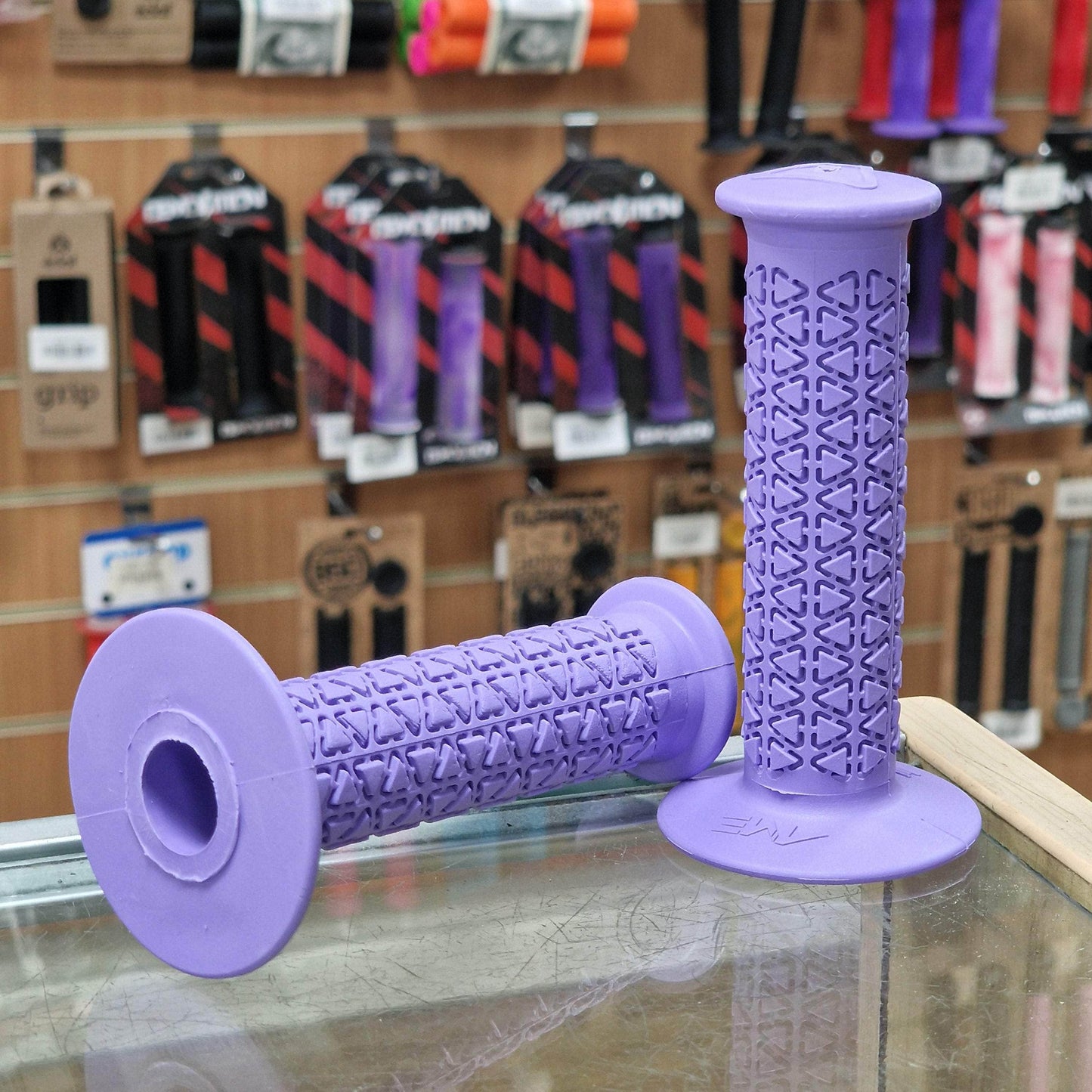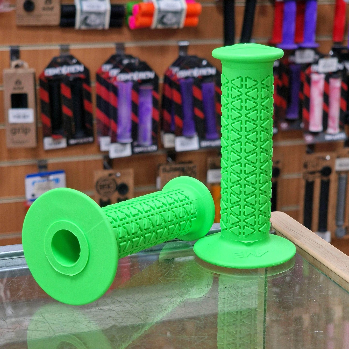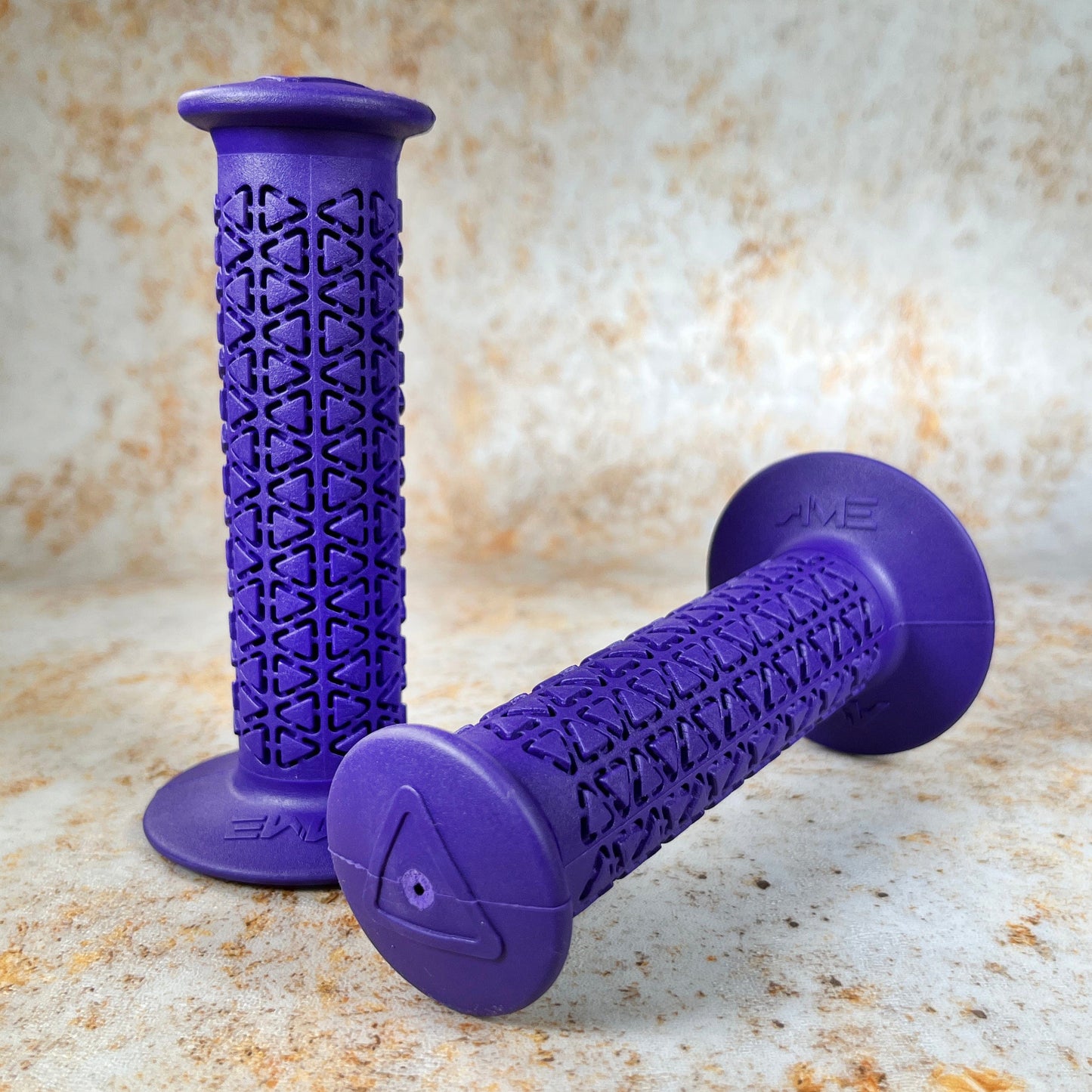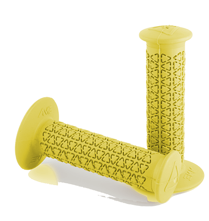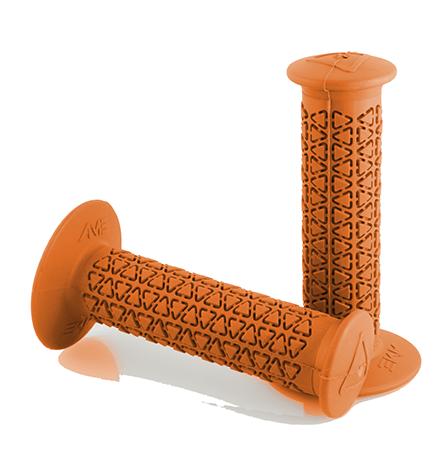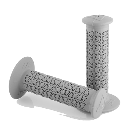 A’ME BMX grips are composed of Vulcathane,™ a specially blended rubber compound combined with UV stabilising ingredients that exhibit superior oxidation and ozone resistance. As a result, A’ME BMX grips will not absorb moisture, deteriorate, harden or become slick with age, all the while providing and maintaining superior comfort.