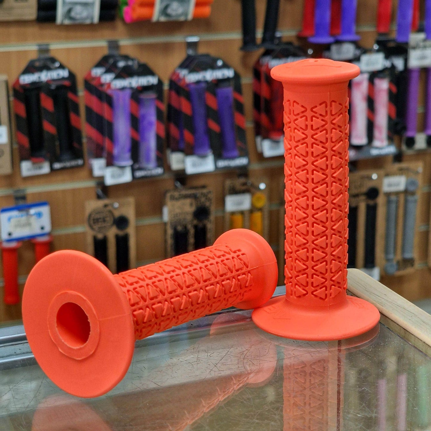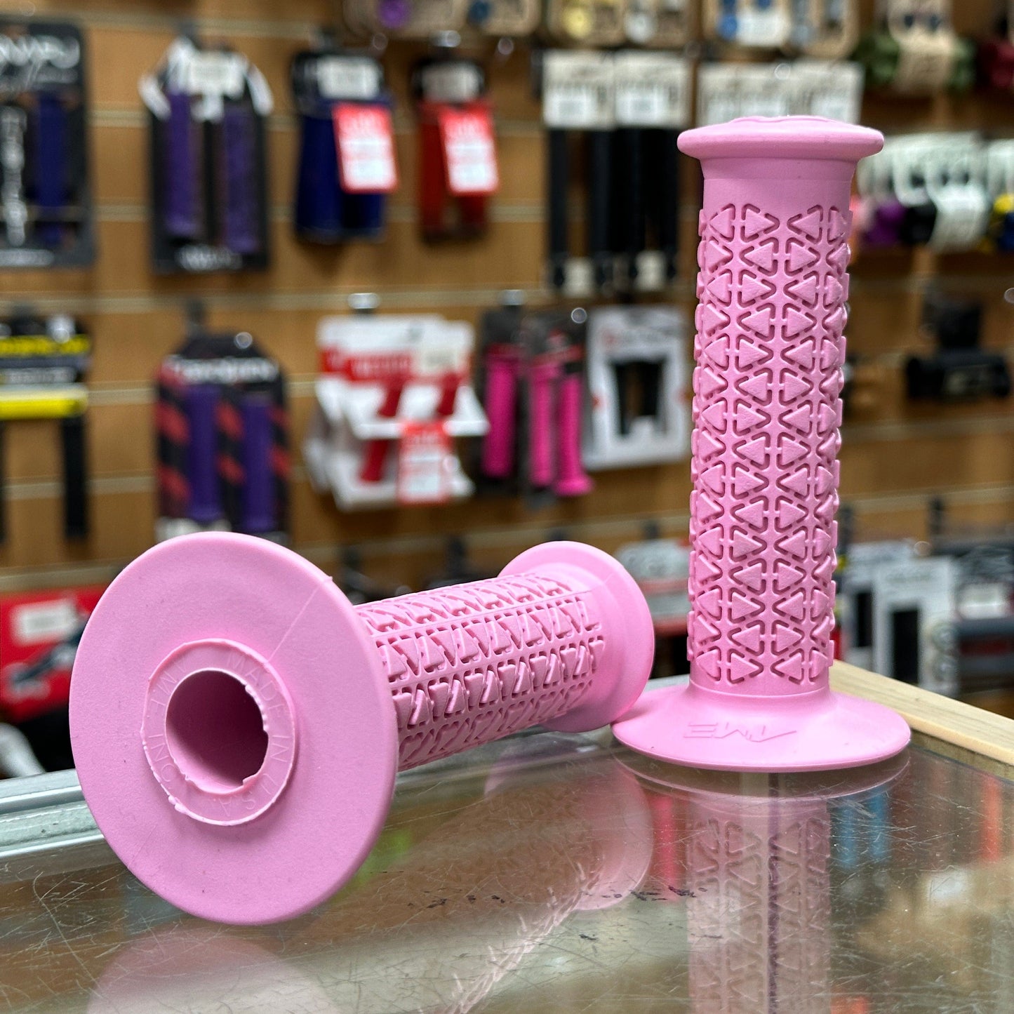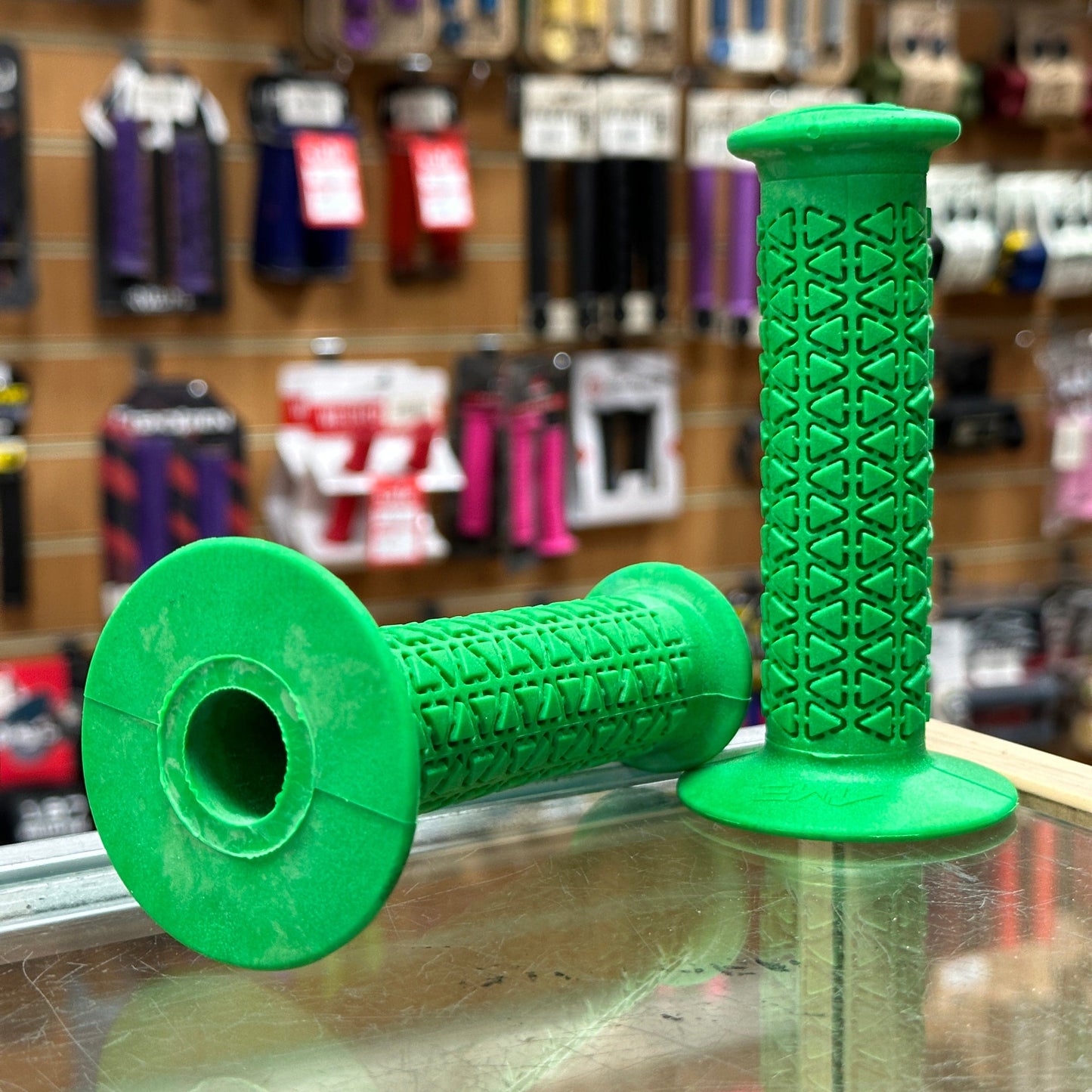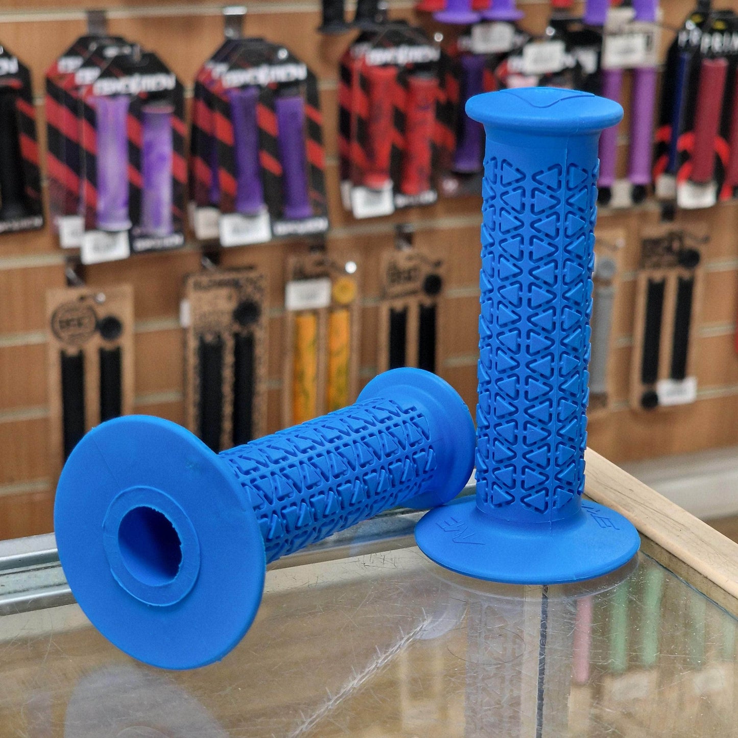 A’ME BMX grips are composed of Vulcathane,™ a specially blended rubber compound combined with UV stabilising ingredients that exhibit superior oxidation and ozone resistance. As a result, A’ME BMX grips will not absorb moisture, deteriorate, harden or become slick with age, all the while providing and maintaining superior comfort.