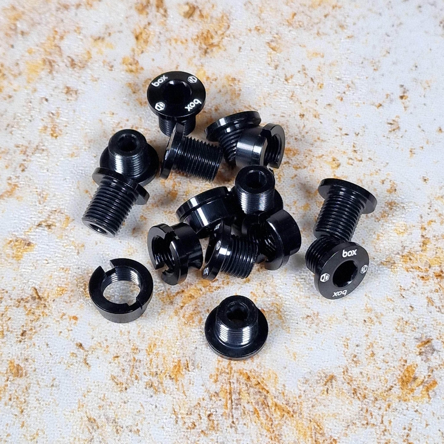 Box One 7075 Alloy Chainring bolt kits include five 8.5-mm front bolts, five 6-mm front bolts, and five 5-mm rear nuts, so they will fit just about any chainring/crank combination, including those with threaded holes.