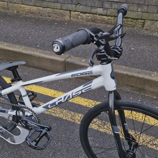 Just when you didn't think it was possible, the new Edge has been improved, now equipped with Shimano disc brakes, updated gearing and crank length, 2 tone paint and graphics, closed rear dropout with integrated chain tensioner system,. The Edge frame also features hydroformed, triple butted, 6061 aluminum tubes with an integrated head tube. Other featured parts on the Edge include 4130 chromoly fork and handlebars, double wall rims with triple engagement rear cassette rear hub, and TIOGA tyres. The combination of all these components arguably makes the CHASE Edge one of the most advanced race BMX bikes available today.