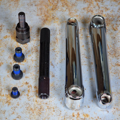 Wrap around gusset design. 3 piece tubular design with heat-treated swaged Chromoly arms, 1 piece spindle/ sprocket boss, 19mm hollow Chromoly spindle with 48 splines and a single flush mount hollow spindle bolt.