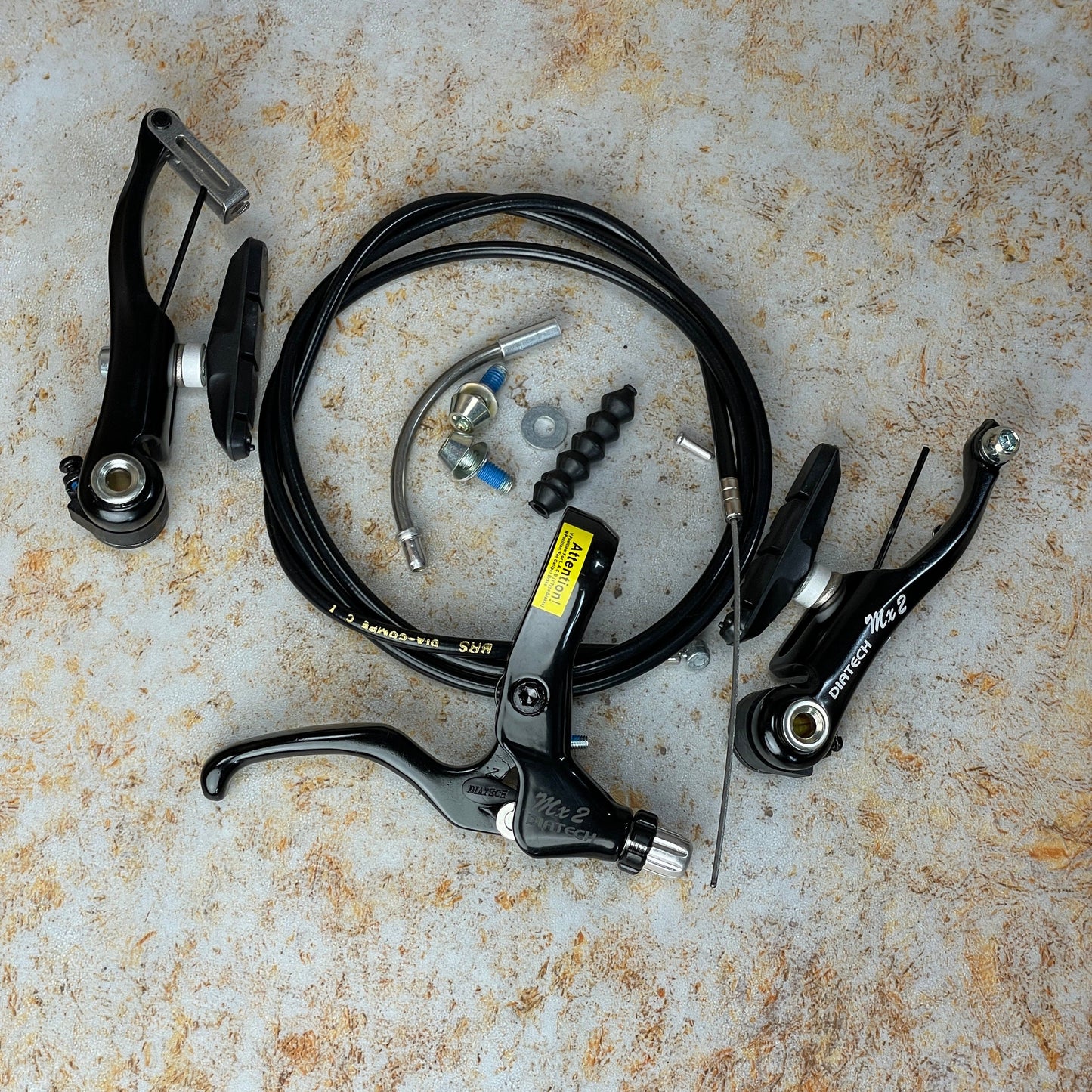 Great value quality complete Dia-Compe brake kit for v-brakes for BMX race bikes, "retro" bkes that use v-brakes and mountain bikes and hybrids that use v-brakes, comprising: