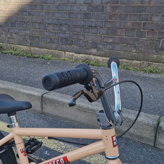 Small diameter handle grips and a short reach brake lever help keep young riders in control. Low tension U-brake springs and a linear brake cable make slowing down easier while a longer 200mm seat post for 2026 allows for more adjustability. We have also switched from 19mm rear axle nuts to 17mm to allow riders to use smaller diameter pegs. A lot of small details making for one big improvement.
