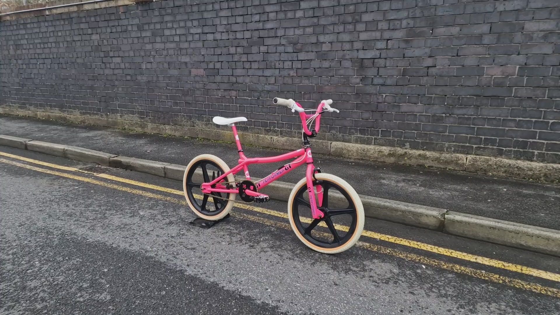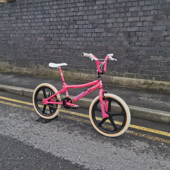 Customer build 1999 GT Perfromer, backdated to 80's pink. The origonal '99 GT frame, fork, bars, seatpost and cranks have all been powdercoated hot pink. Piston stema nd seat clamp are original.