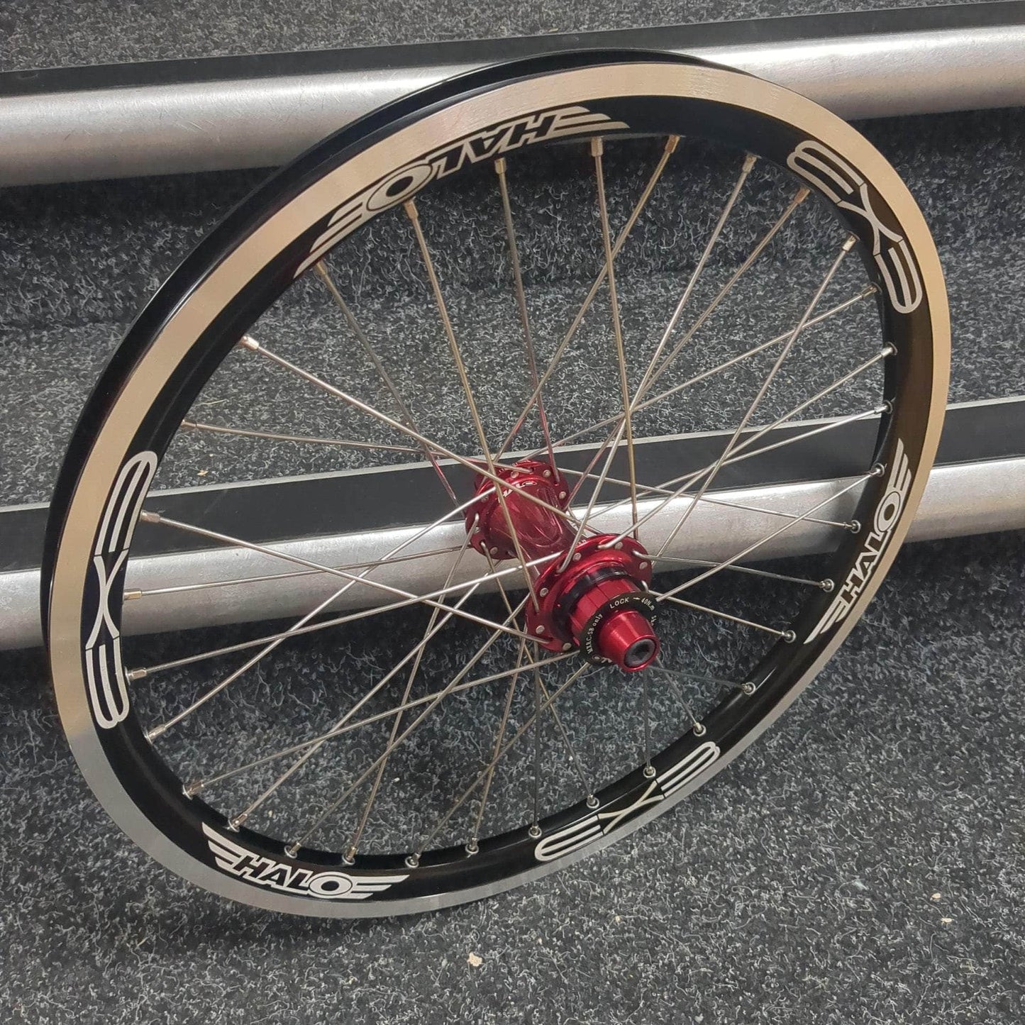Precision assembled and hand trued with Halo Double butted spokes, 7075 CNC alloy nipples and Halo MX series hubs and double wall, eyeleted Halo EX3 (1.5) rims.