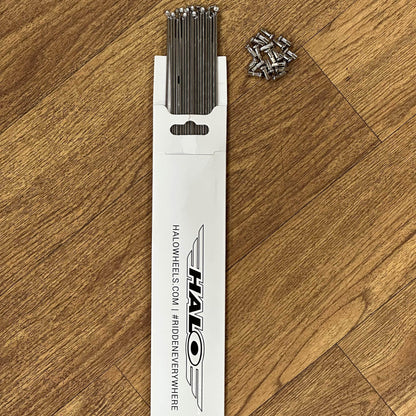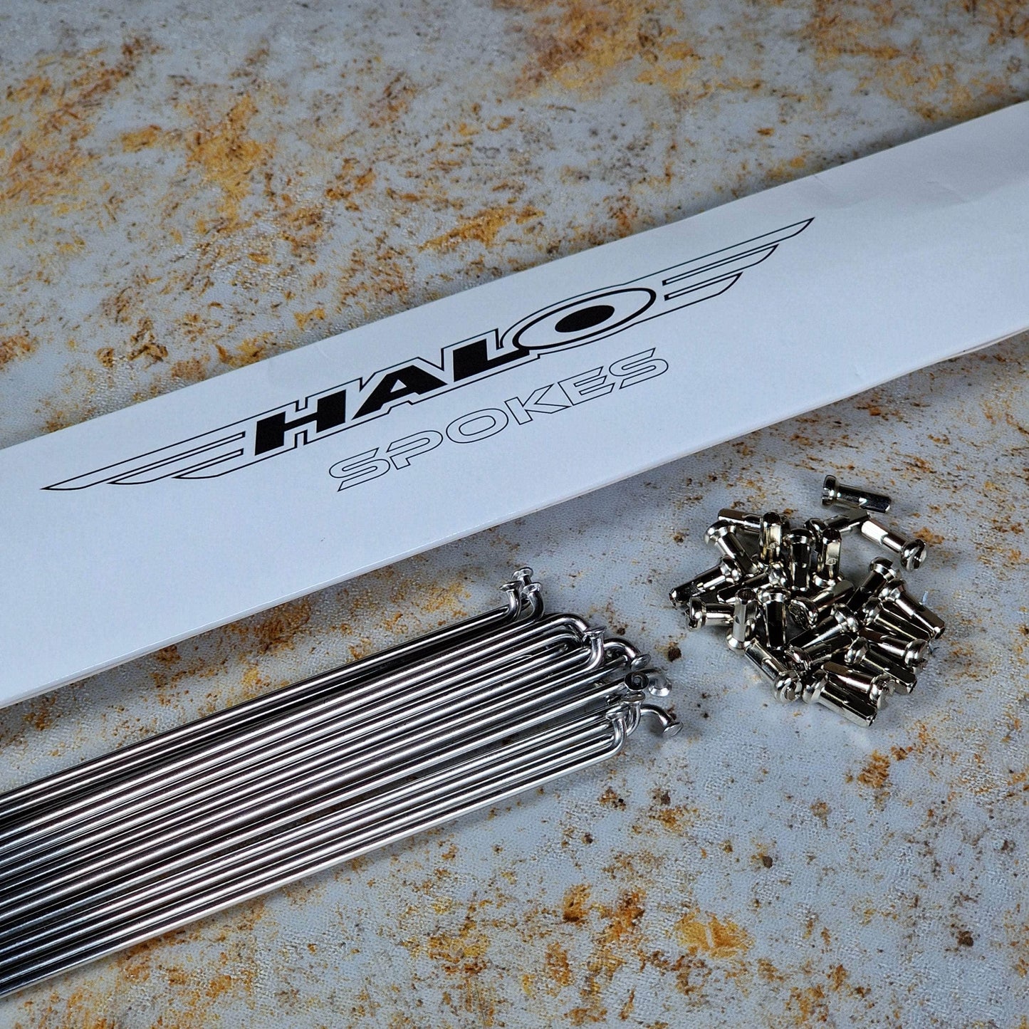 A pck of 20 high quality genuine Halo stainless 14 plain gauge spokes, with 14 gauge silver brass nipples.