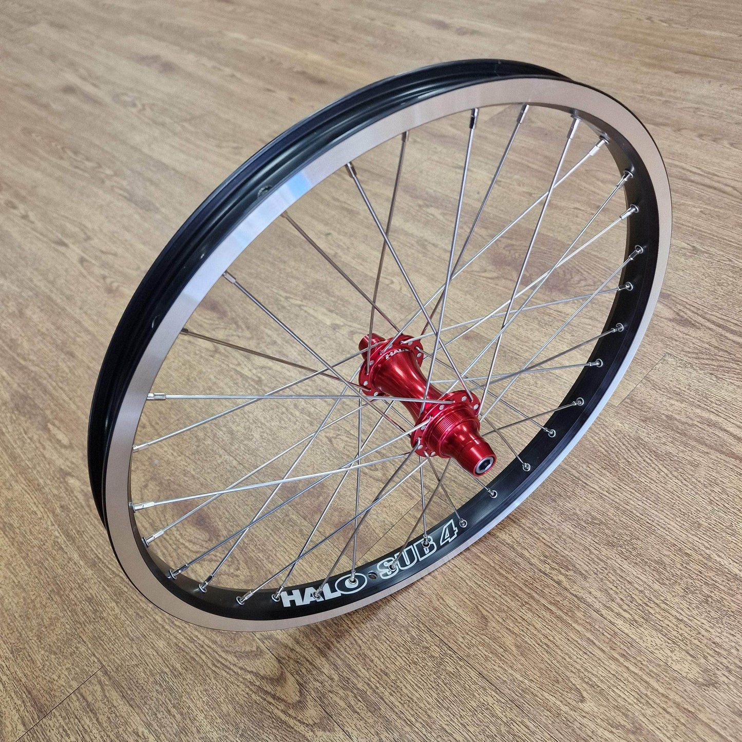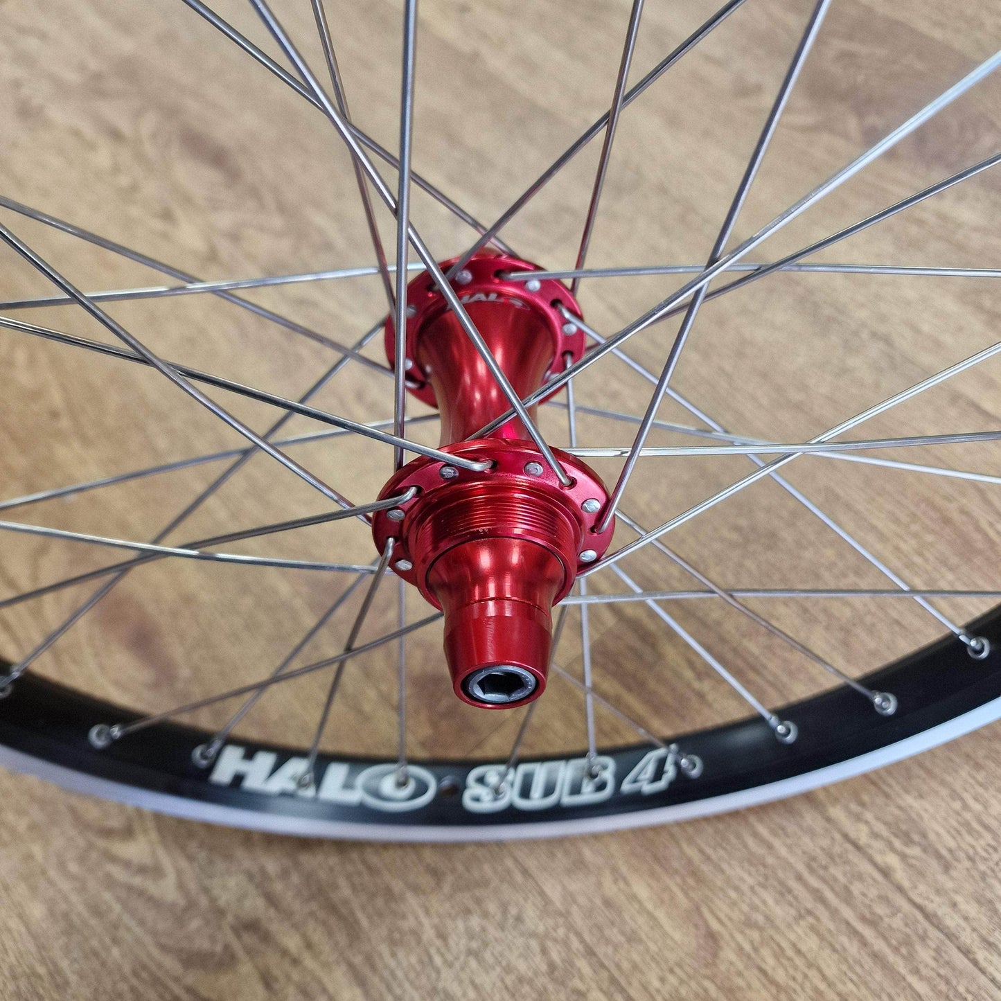 This wheel was built up in house by our mechanic Adam using a 32h Halo Sub 4 race rim and MXR-FW hub in anodised red.