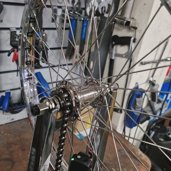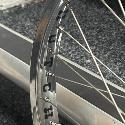 Like almost every component on the Hutch Trick Star, the rims were developed from scratch with new tooling made to specifications. The brand new Hutch x7x rims are a modern take on the classic with double-wall construction, welded seam, and steel eyelets in place of the moto-x dimples. Production rims are CHROME plated. The hubs look just like the original right now to the nickel plated finish but are designed for a modern freestyle bike with 10mm front axle and 14mm rear with 9T driver.