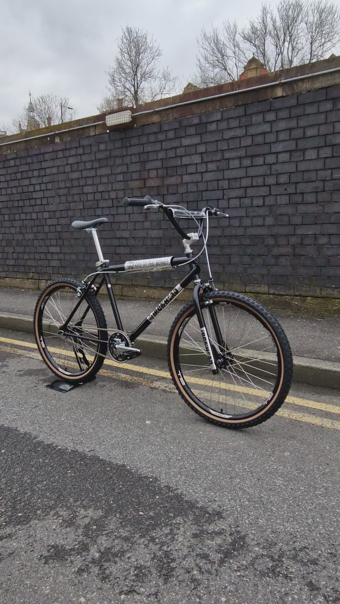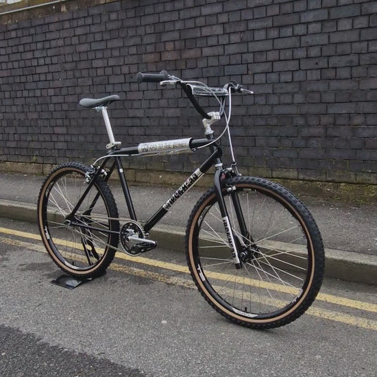 A new Motocross-inspired Ironhead 26" cruiser with conventional SunTour type stem, Fairdale MX bars, cro-mo cranks and heavy-duty Halo rims. Black and Silver, custom built, one-off, assembled right here with top quality parts by Adam. The frame features a Euro BB, Included Headset, Thick Lasercut Dropouts and a Long Wheelbase for that Old School look but with more coventional bar and stem combo - these things ride amazing!