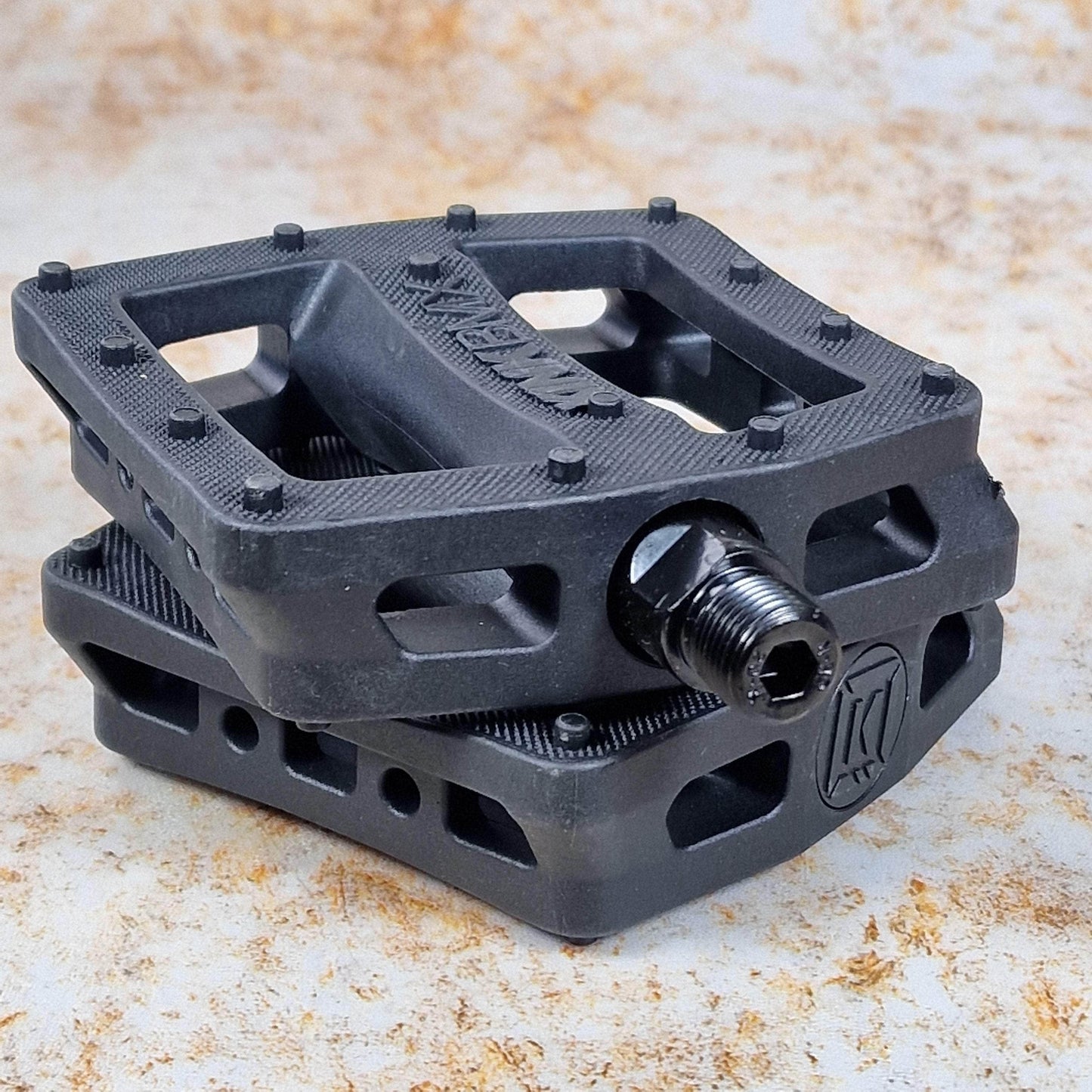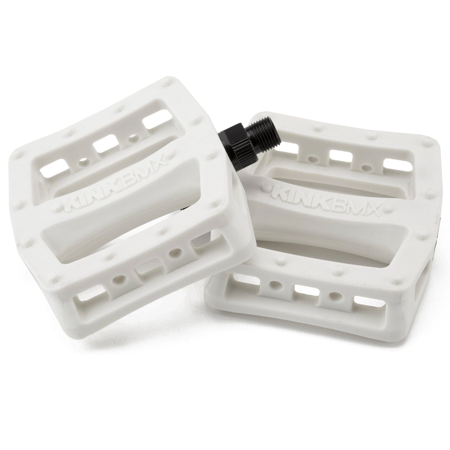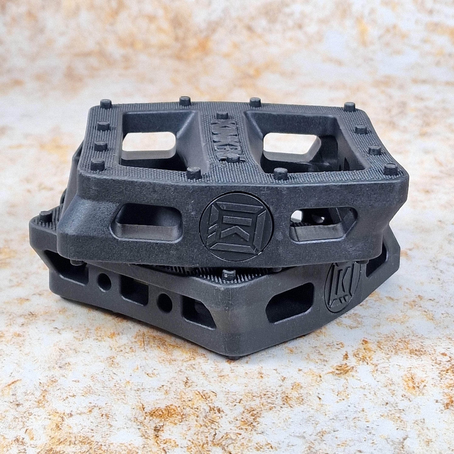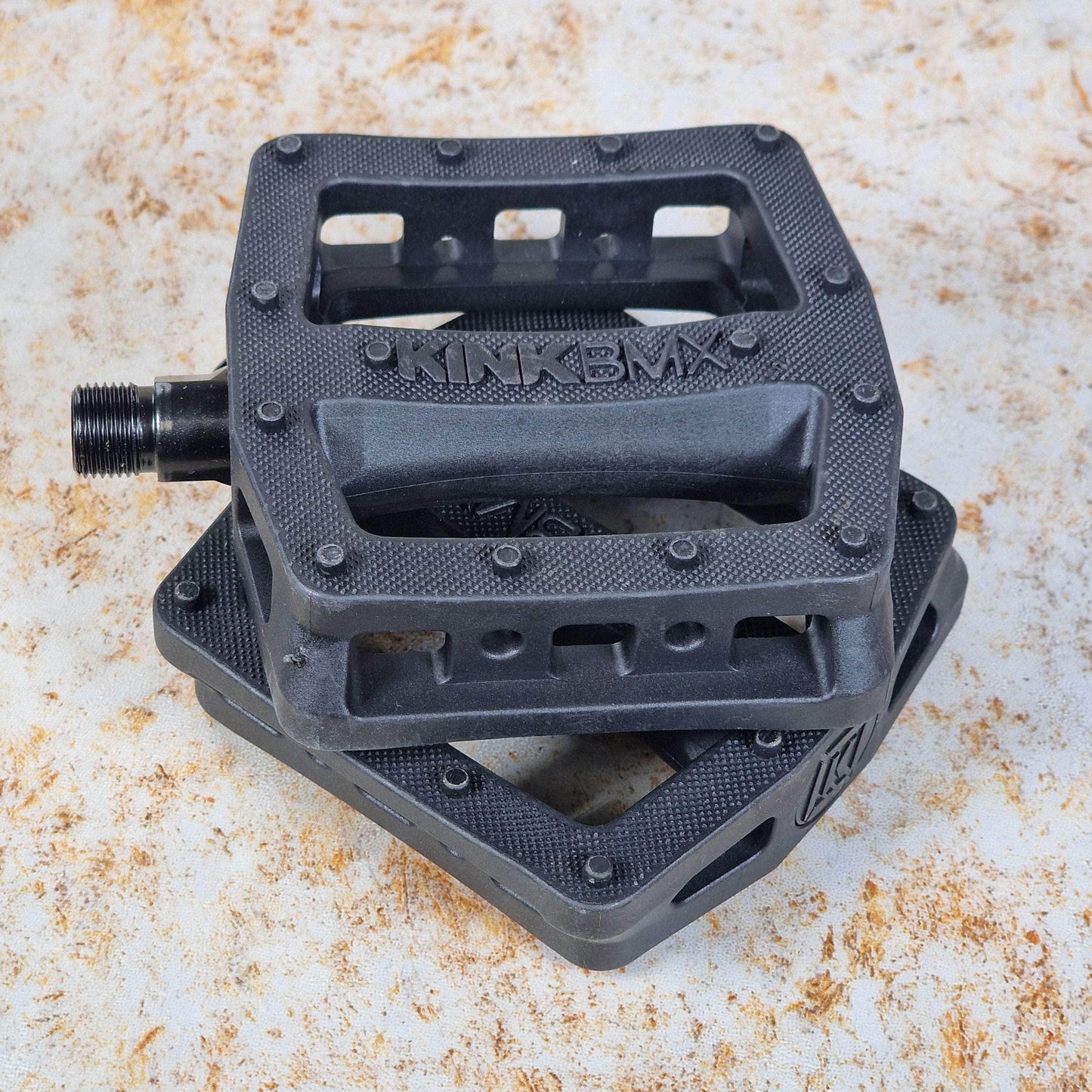 The Kink Hemlock pedals are made from an ultra durable nylon and fiberglass blend material, and spin on a tough chromoly spindle. Featuring 14 molded pins per side and covered with micro knurling across the entire platform, these pedals provide great traction. The generous platform size and concaved body, provide a super comfortable pedal.