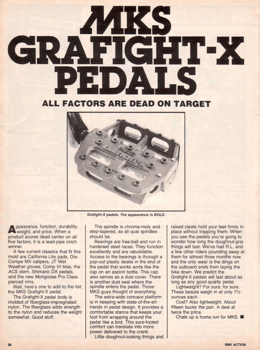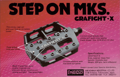 In 1982, MKS released the GRAFIGHT-X, which became popular amongst freestyle BMX riders. Since it went out of production, MKS have received many requests to remake this legendary pedal, well now MKS have released a modified version known as GRAFIGHT-XX, which keeps features of original.