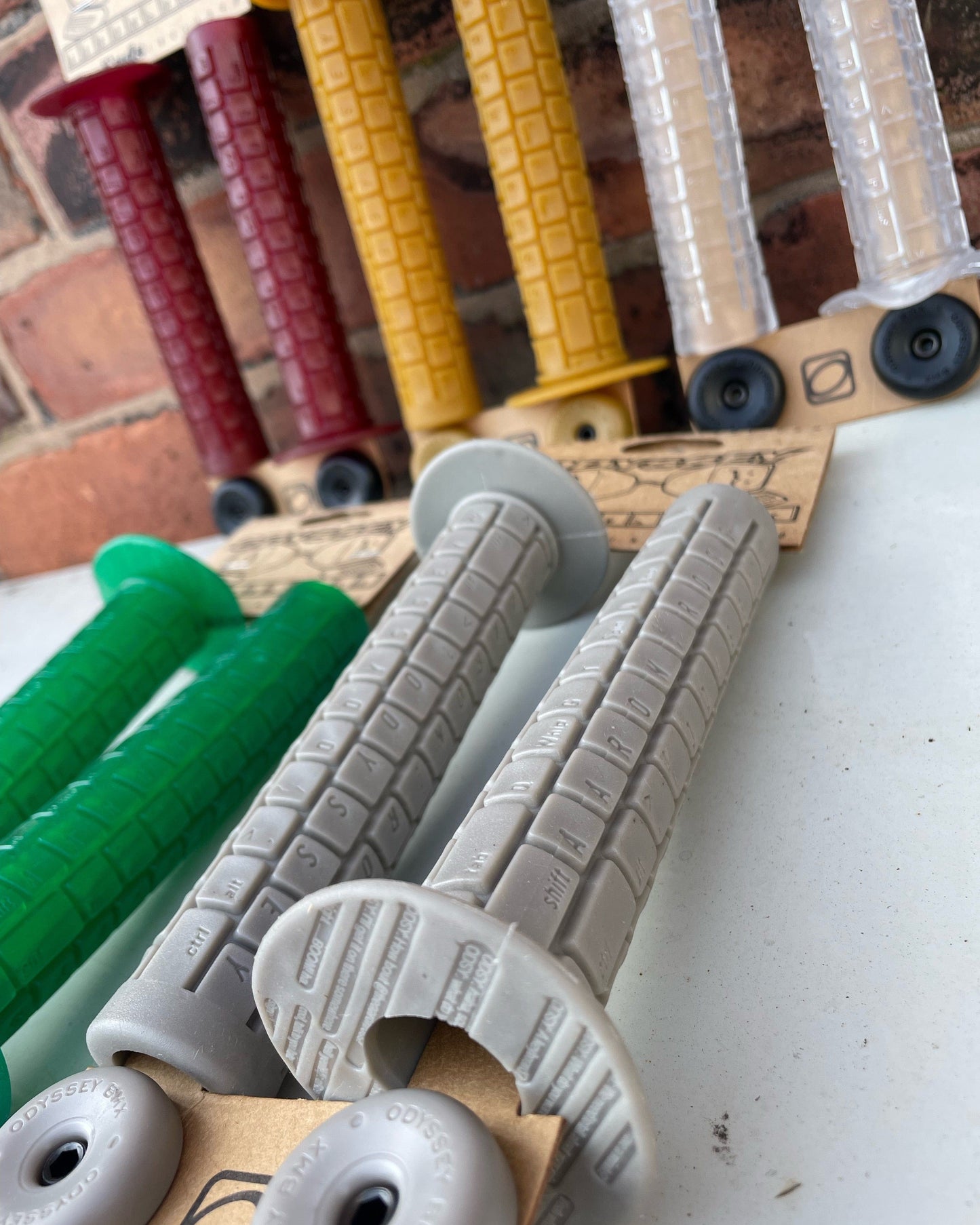 From our archives here is Aaron's super soft and comfy OG grips. Think of those key pads as rubber blocks of cushion. In regards to the flanges, Aaron doesn't like them, and you have the option of cutting them off if you don't like them either.