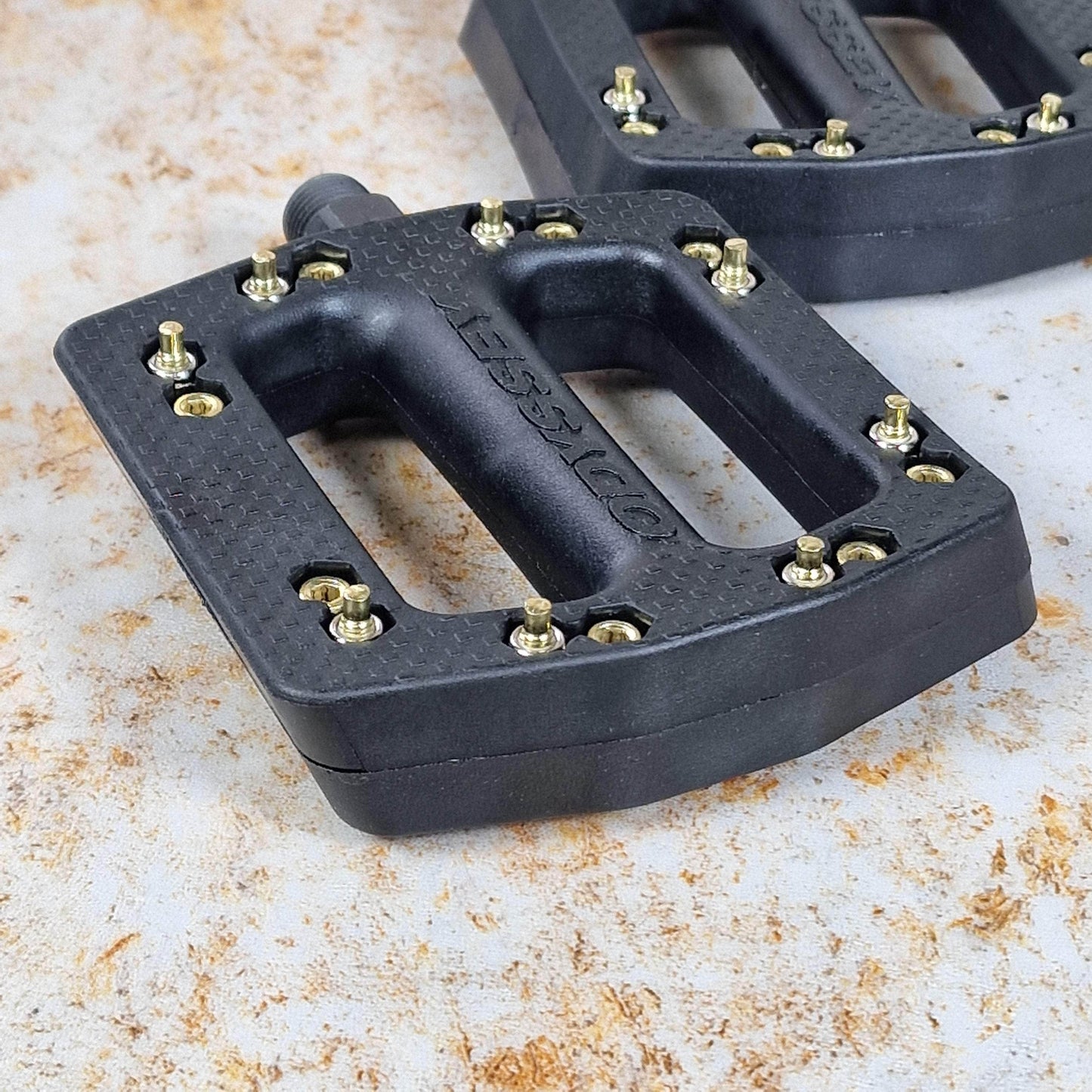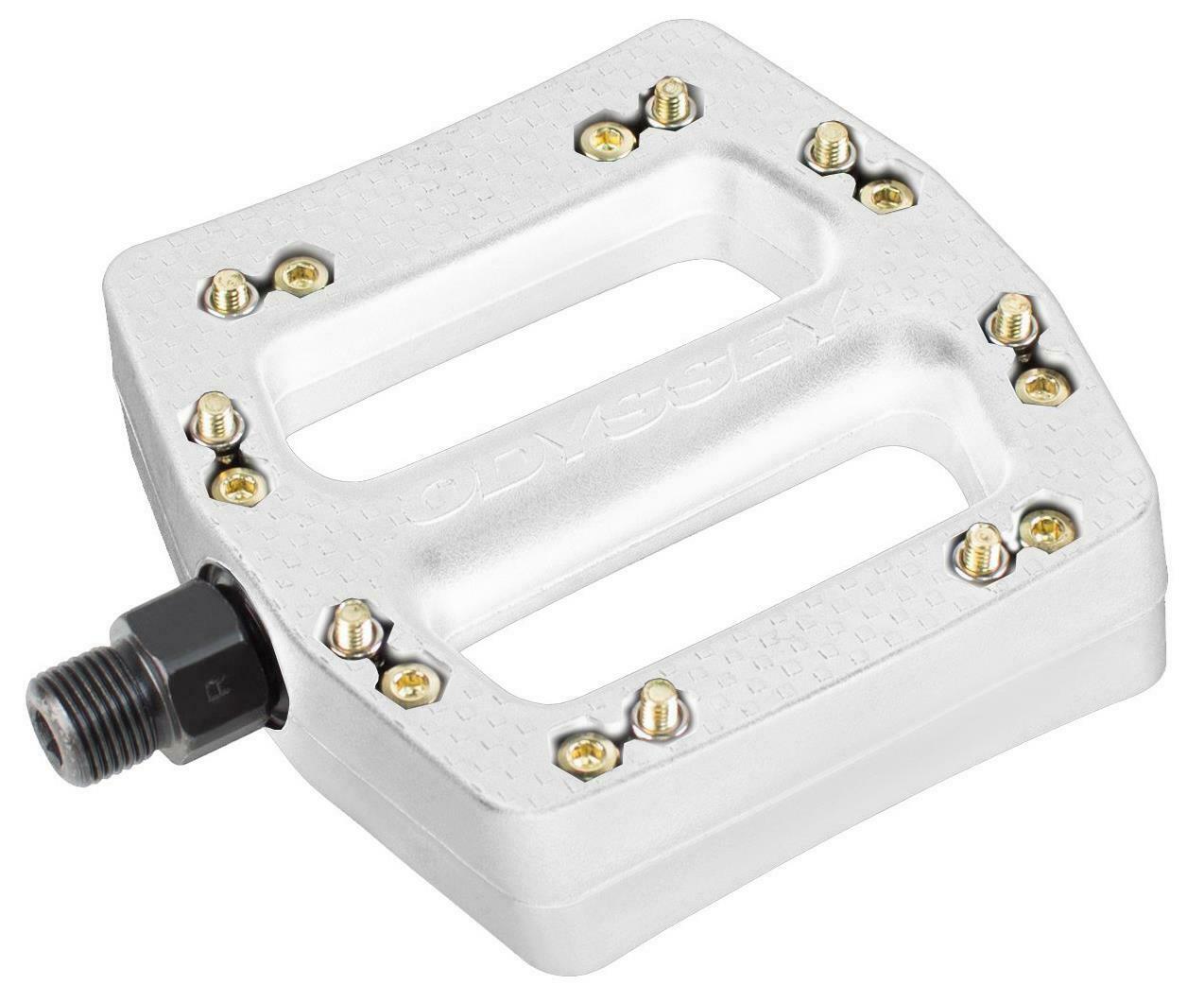 The OG PC pedal from Odyssey is a huge leap forward in pedal technology that results in a simpler overall design. Extremely light weight plastic bodies eliminate the need for bearings and allow for a spindle that is significantly stronger than normal. Metal pins make the pedal very grippy, and the pedal will still function normally when pins are removed from one side for grind tricks. No flimsy outboard end caps. Pedal body halves are easy and inexpensive to replace - instead of replacing the whole pedal.