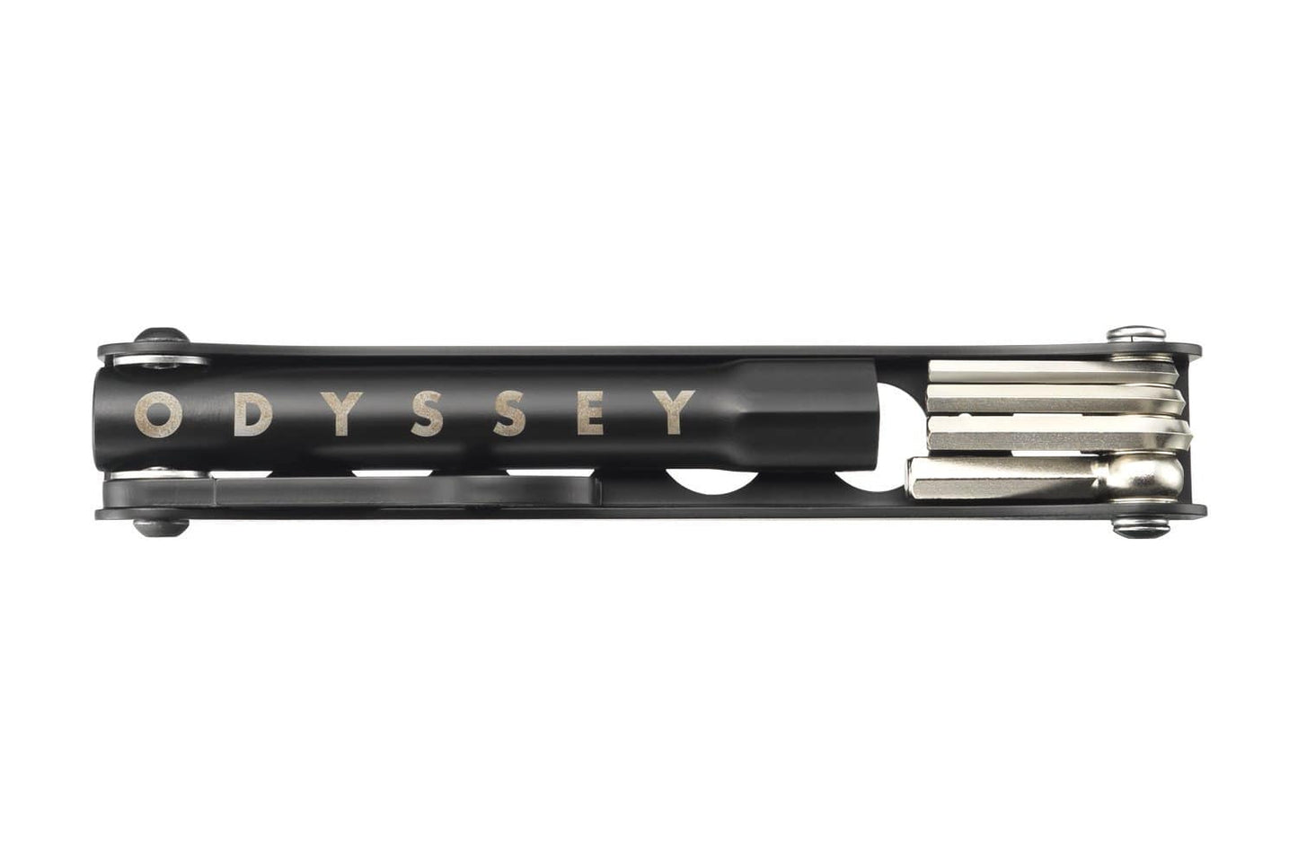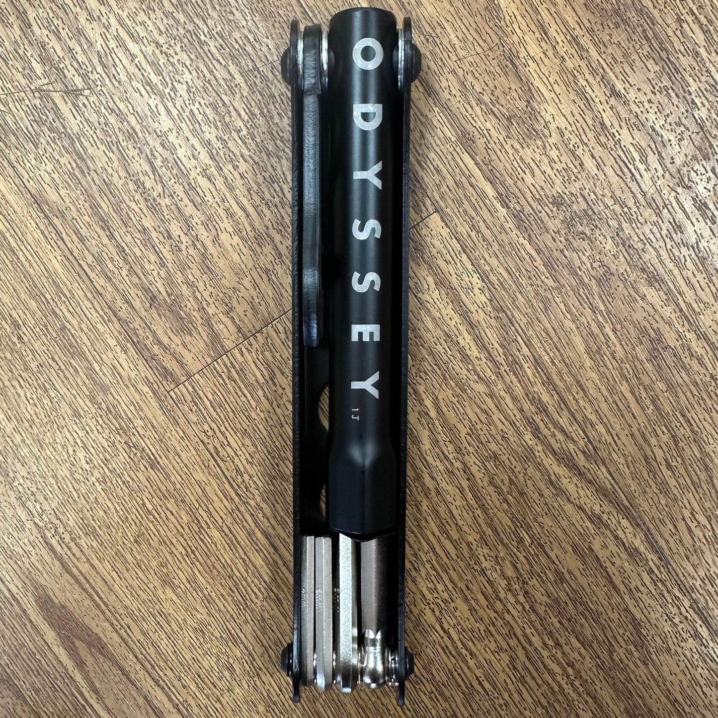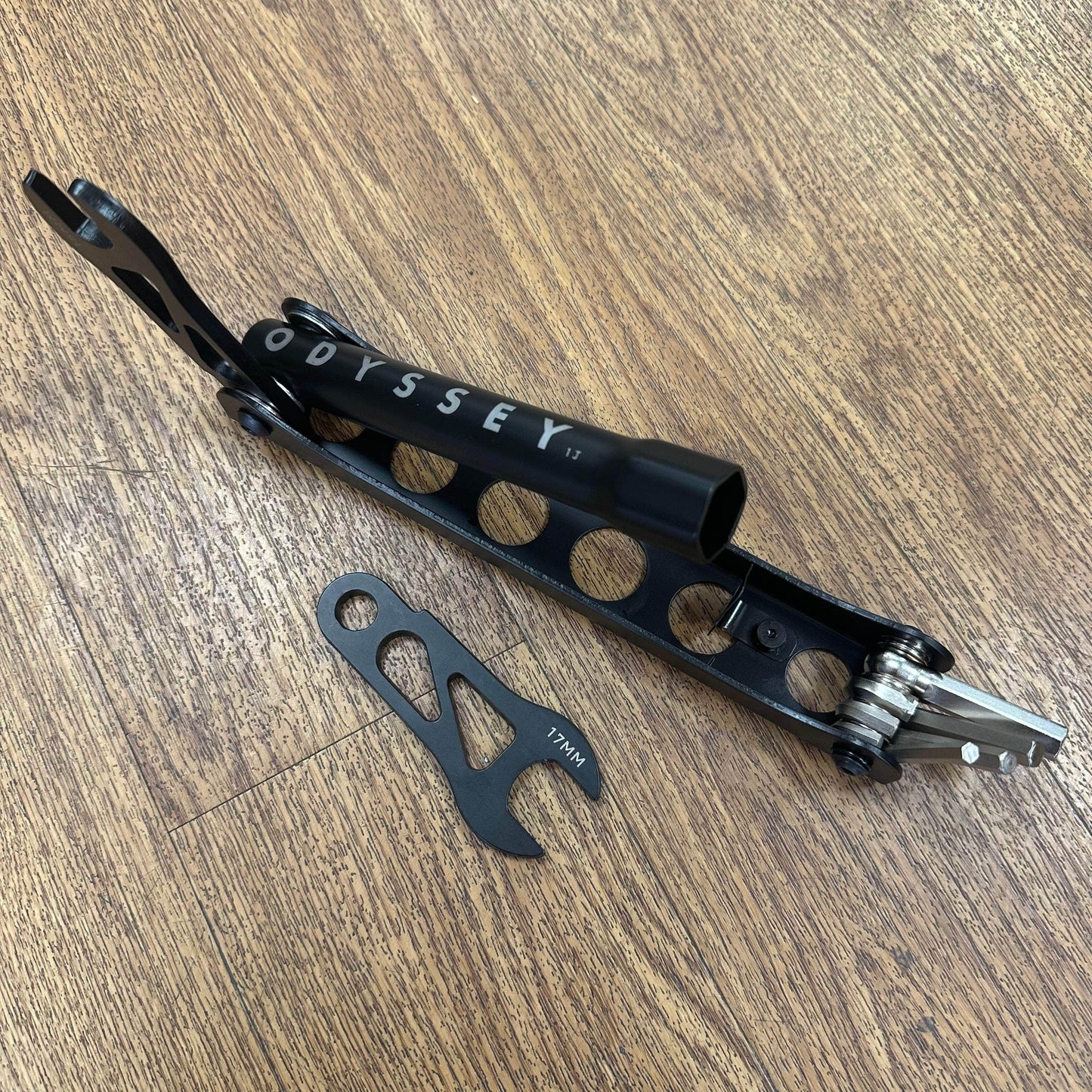 Odyssey's first multi-tool includes all the key bits to assemble and disassemble your bike on-the-go, and is one of the most affordable compact multi-tool available. Includes a 15mm and 17mm swappable pedal wrench, 4, 5, 6 and 8mm hex wrenches and a 17mm socket with an integrated storage compartment. The Travel Tool is light and easy to carry, but big enough to allow you to actually tighten everything down properly.