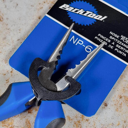 The NP-6 is a professional-quality needle-nose pliers packed with features. The narrow multifunction jaws measure 2.5 mm at the tip to get into tight areas, and feature flat and rounded gripping areas, a crimping tool, and a cutting blade with integrated wire stripper. Useful for grabbing retaining pins, disc brake pads, and more. Constructed of forged, heat-treated chromoly steel with a hidden spring and soft-touch dual-density grips.