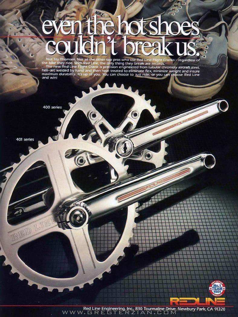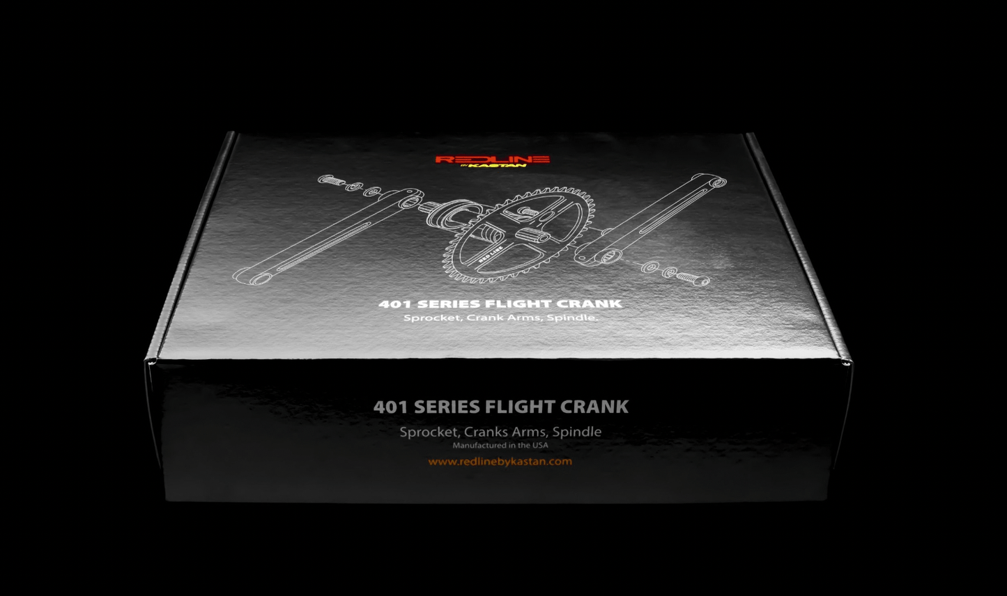 Referencing original drawings and specifications, the Redline by Kastan 401 Flight cranks set is built to original era specifications identified as a reissue by a small RBK stamping on the rear of the arm between the spindle boss and sprocket drive boss. The crank arm is produced from swaged 4130 chromoly steel with decal pockets stamped into both sides of the arm and a single pinch bolt installation system. The crank is currently available in 175 mm length.