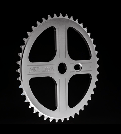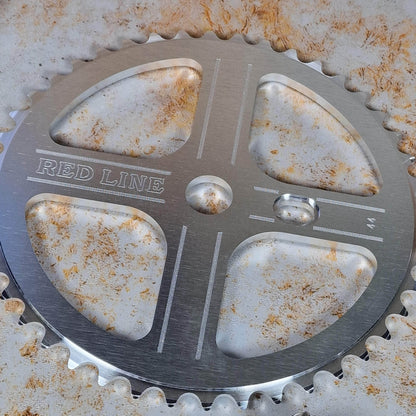 The Redline Vintage Flight 44-tooth sprocket is manufactured using CNC engraving to recreate the logos and surface design accurately.