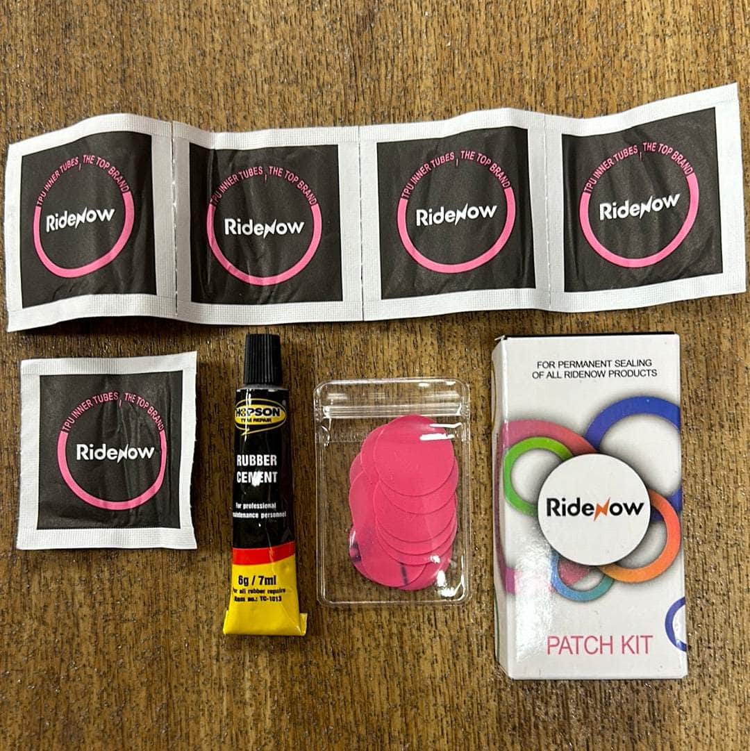 Puncture repair kit for the RideNow innertubes, which contains 12 patches and glue to apply.