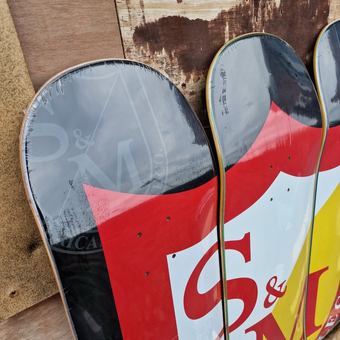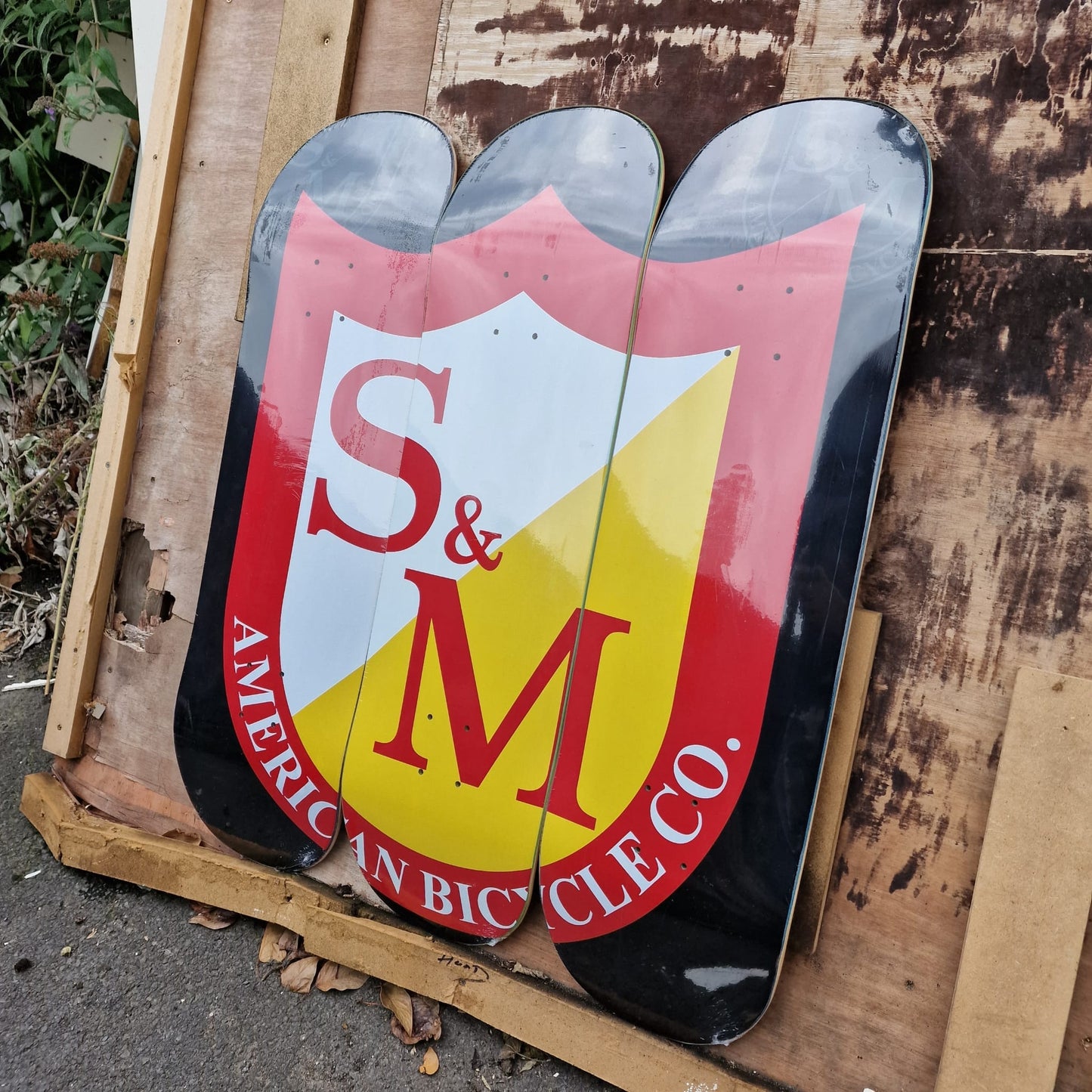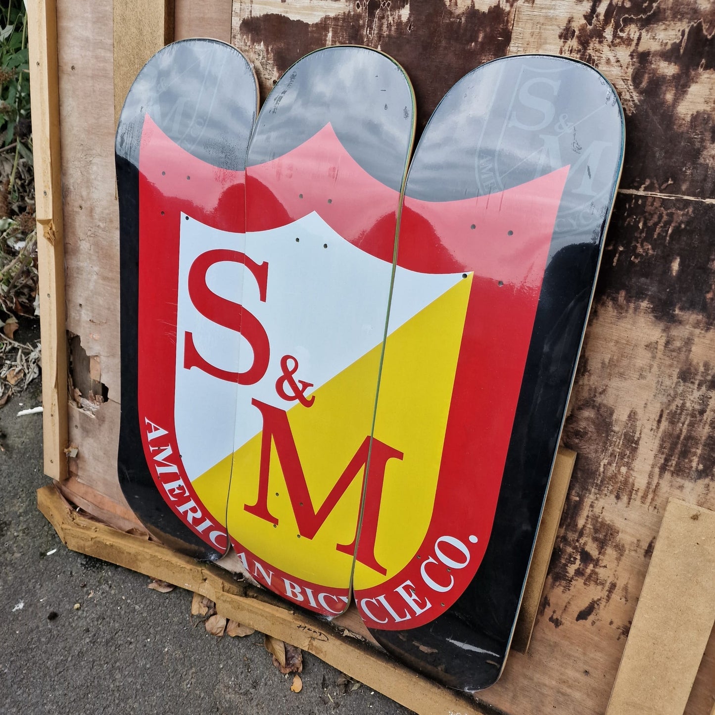 Handcrafted American made skateboard deck that with all three creates a large Shield logo.