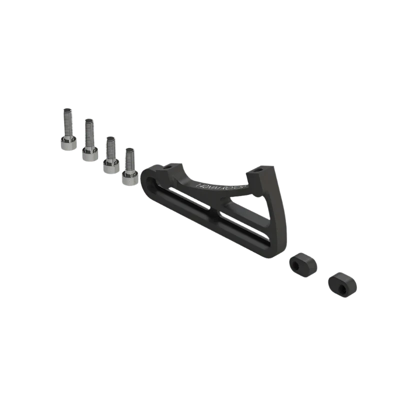 The Syndyt Caliper Mount Kit includes an aluminum post mount for a 140mm minimum diameter brake rotor. Two lengths of stainless steel M6 screws are provided for either PRO or EXPERT frame sizes, which thread into the aluminum mounting nuts.