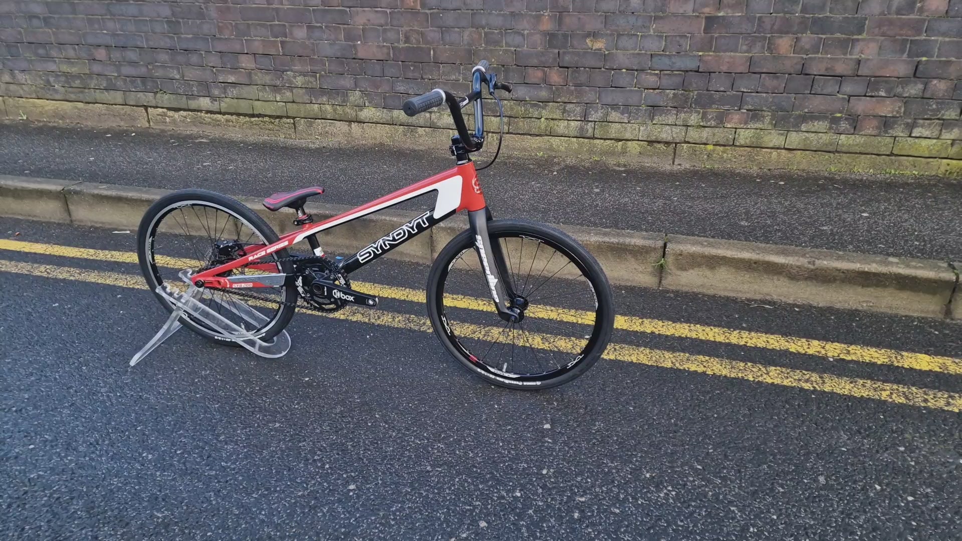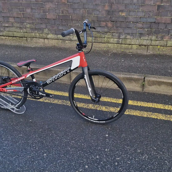 A full-custom SYNDYT Expert XL race bike stacked with all high end after market components (including carbon forks) and a Shimano hydraulic disc brake.