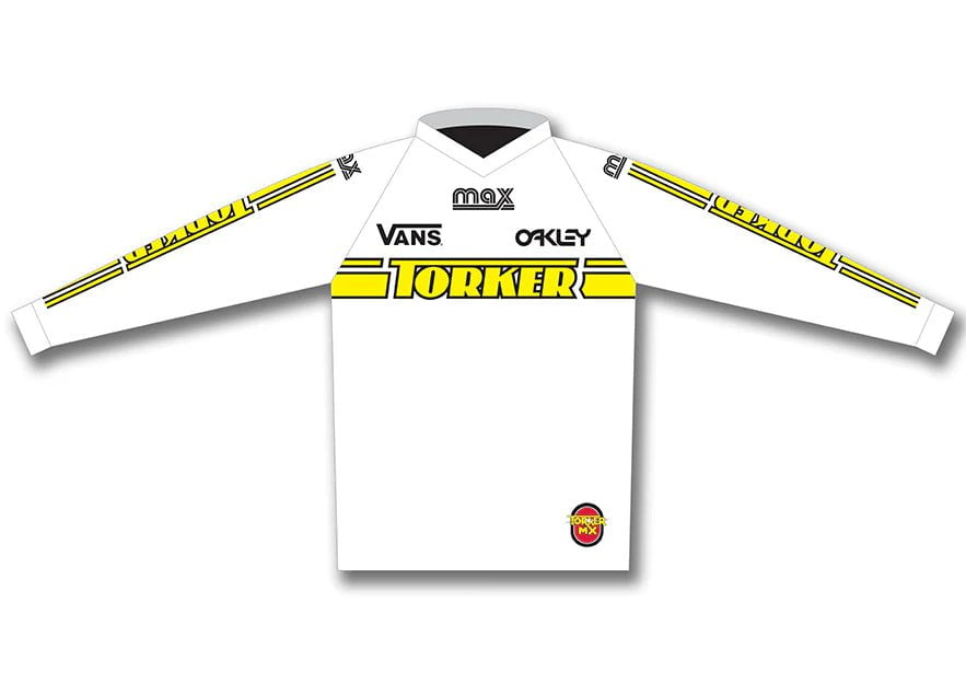 As the Torker Family grew and evolved, so did the jersey style. This is probably the most famous of the Torker Racing Jerseys, as Clint Miller, Jason Jensen, Cathy Hanna, and the others made this simple White, Black and Yellow Jersey iconic.