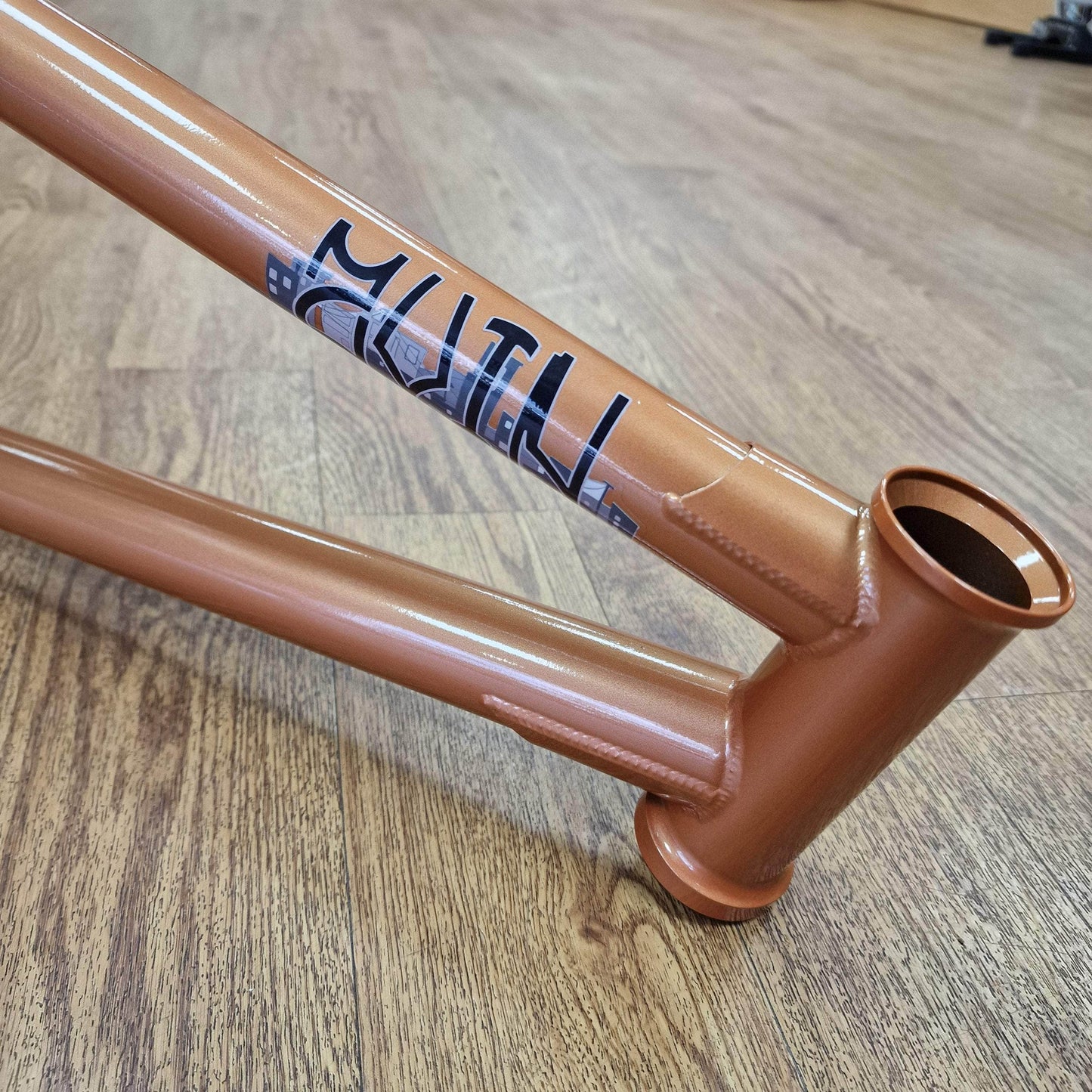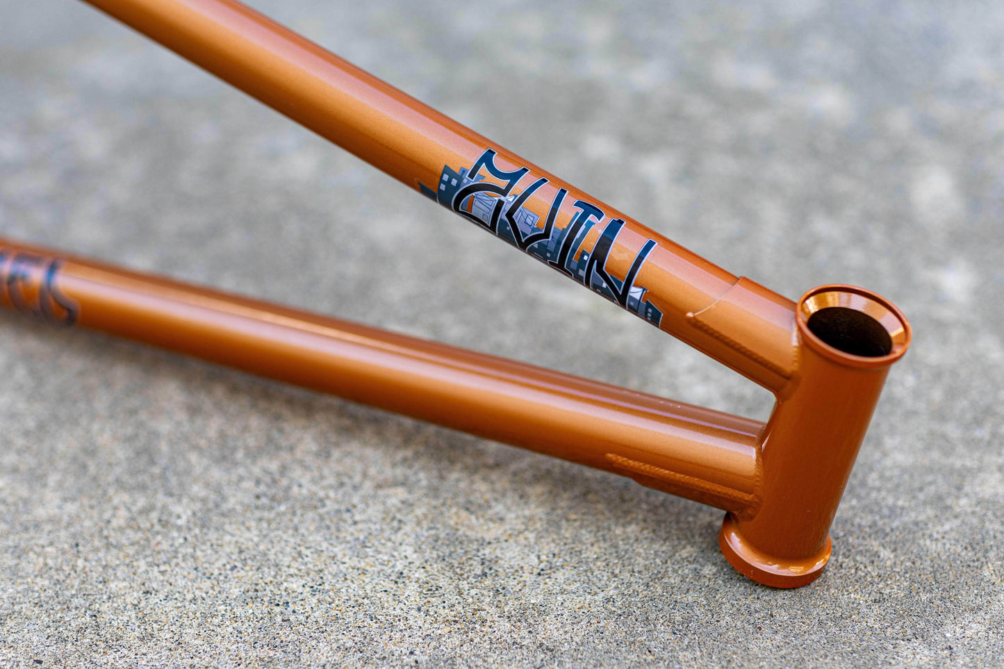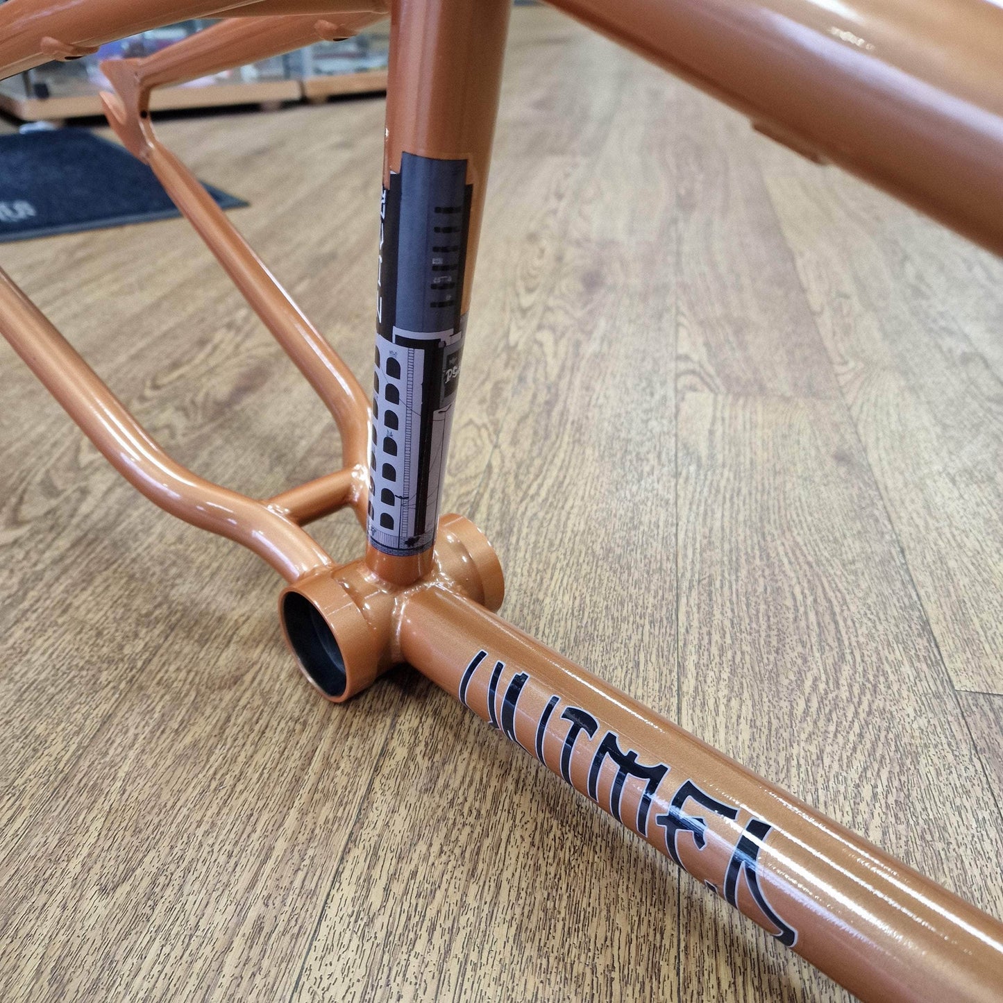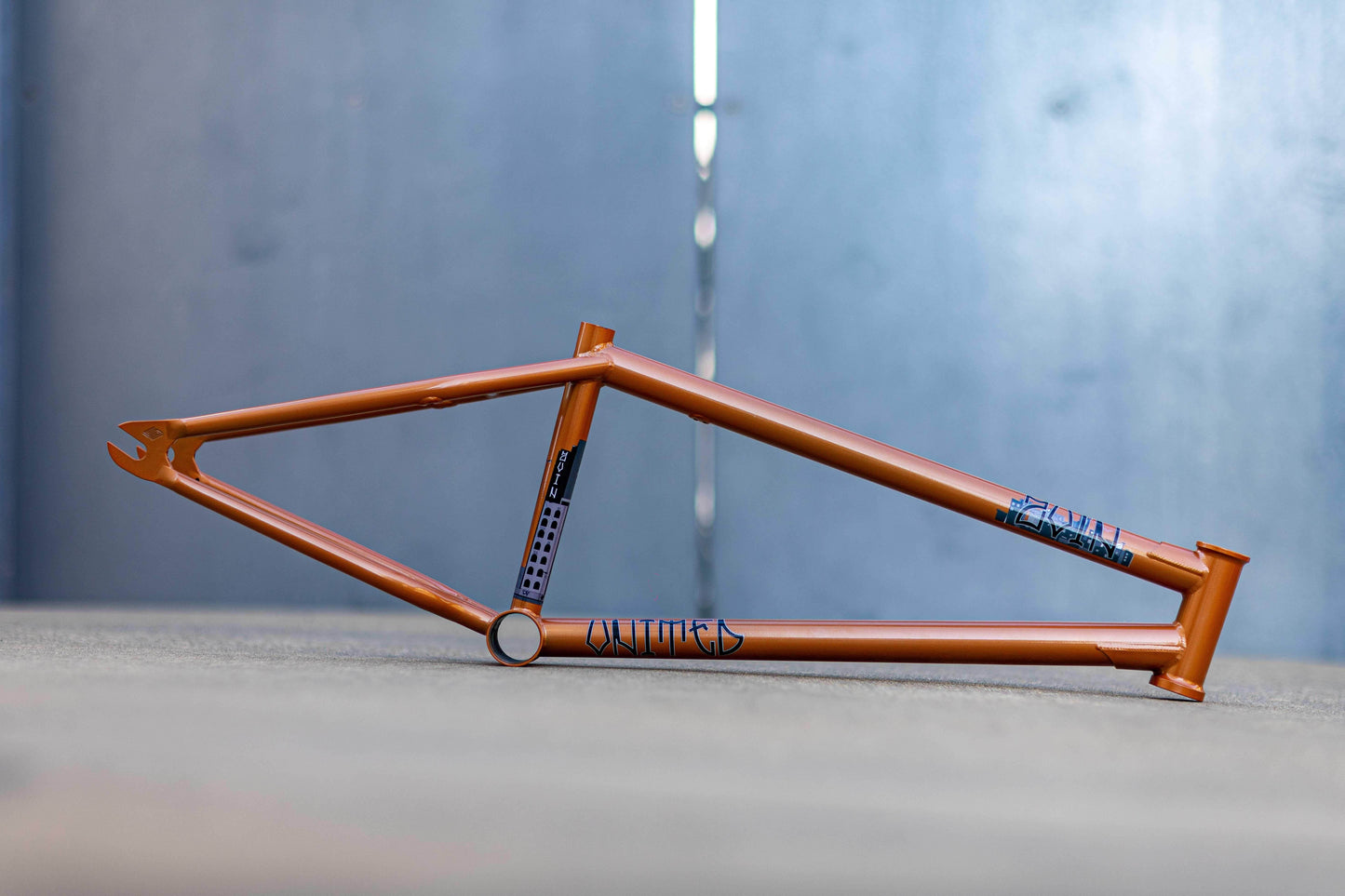 Miki Fleck's Signature "ZUIN" Frame in this Trans Bronze colurway is the latest addition to United's collection, boasting Invest Cast Drop Outs, integrated Chain Tensioners and Removeable Brake Mounts from its predecessor, the Incarnate V2. Extending the Chain Stay to 13.25" Slammed and increasing the Stand Over to 9.3" offered this bike the versatility it needed to survive Miki's riding style.