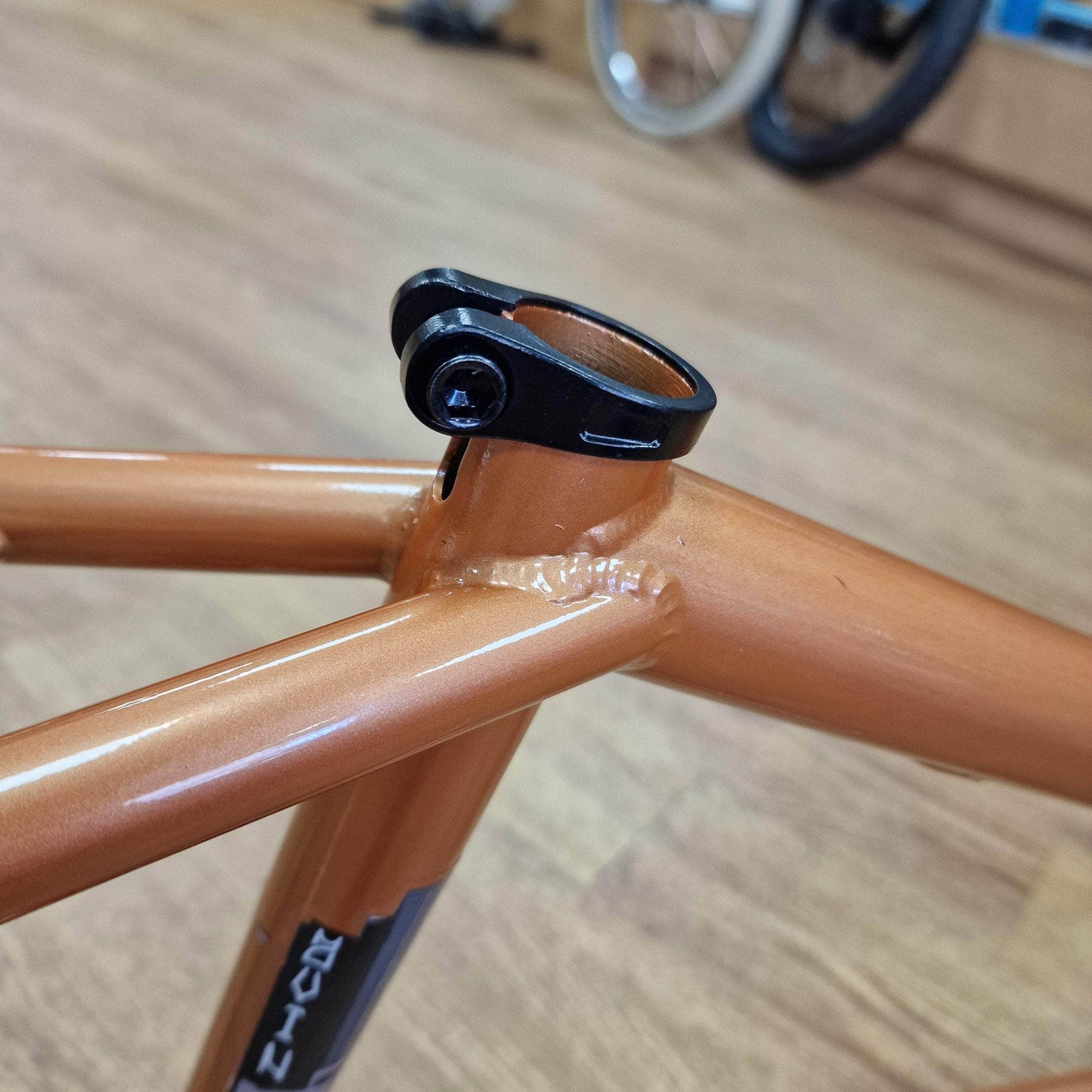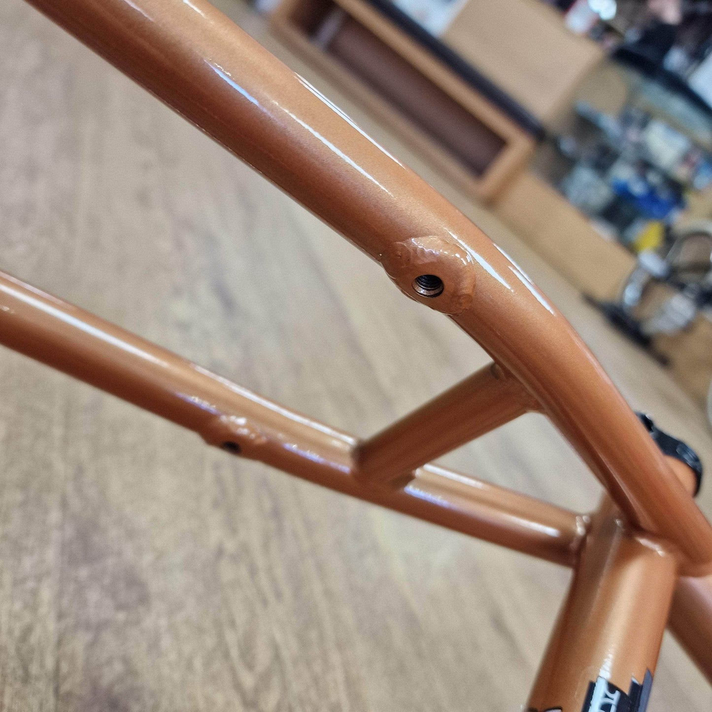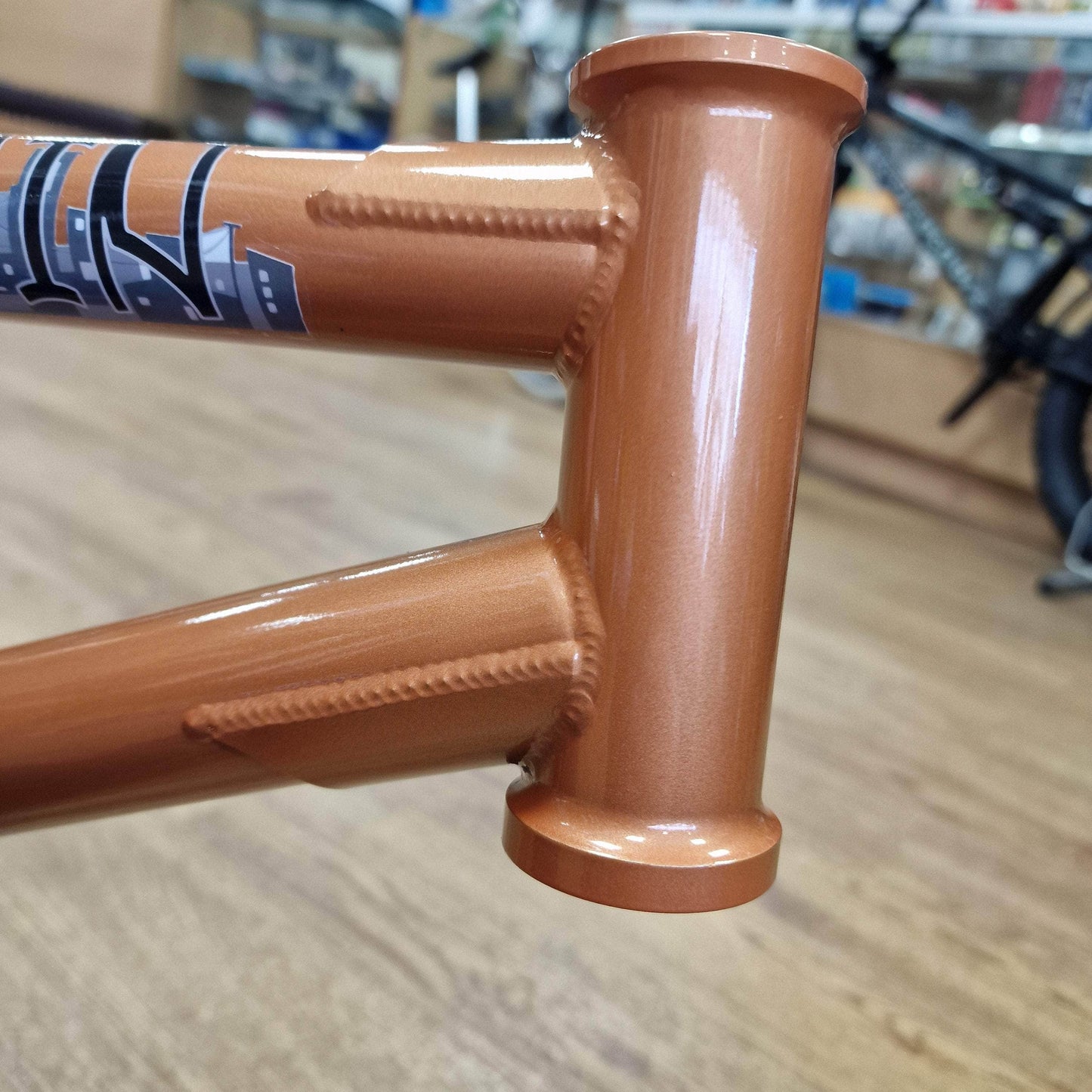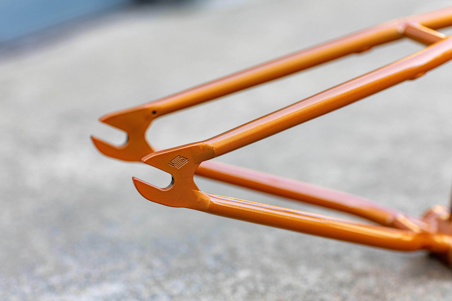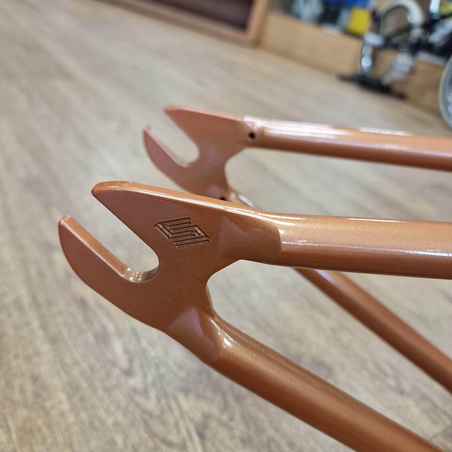 Miki Fleck's Signature "ZUIN" Frame in this Trans Bronze colurway is the latest addition to United's collection, boasting Invest Cast Drop Outs, integrated Chain Tensioners and Removeable Brake Mounts from its predecessor, the Incarnate V2. Extending the Chain Stay to 13.25" Slammed and increasing the Stand Over to 9.3" offered this bike the versatility it needed to survive Miki's riding style.